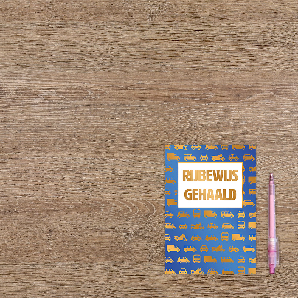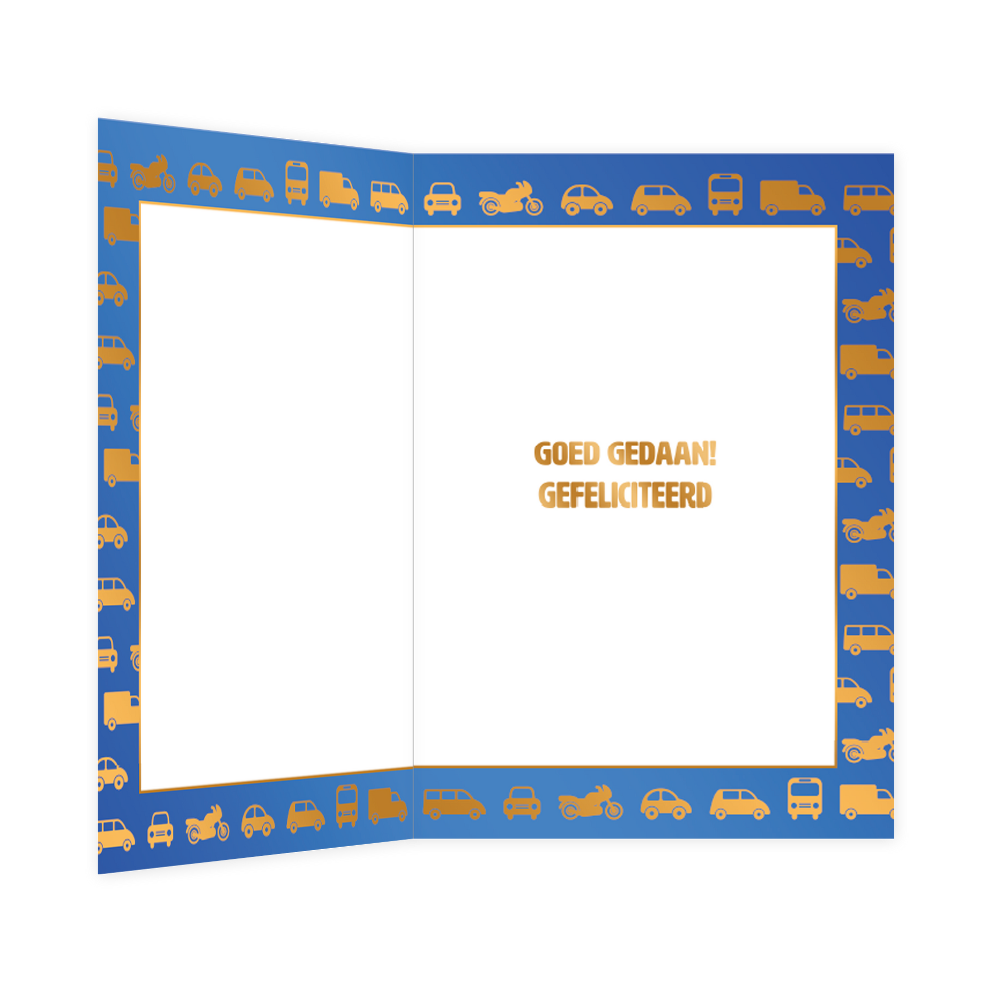 De wenskaart heeft een afmeting van x en een staande vorm. Op deze wenskaart staan gouden voertuigen als auto's, bussen, en motoren met op een blauwe achtergrond. In het midden zit een wit vlak met de tekst: "Rijbewijs gehaald". De binnenzijde van de wenskaart is bedrukt met een ontwerp passend bij de voorzijde van de kaart en de tekst "Goed gedaan! Gefeliciteerd".