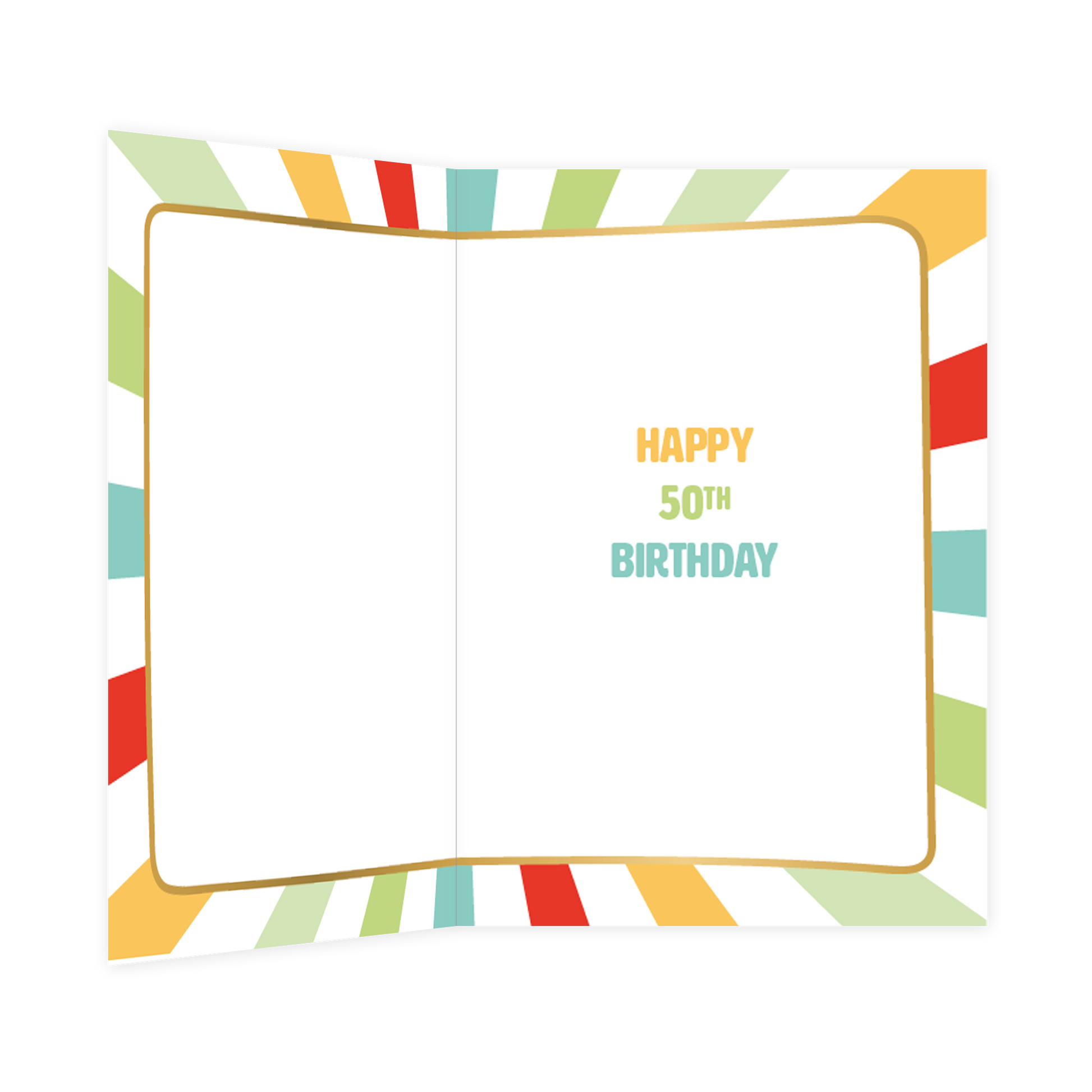 De wenskaart heeft een afmeting van x en een staande vorm. Op deze wenskaart staan lijnen in de kleuren rood, groen, blauw en geel. In het midden zit een wit vlak met de tekst: "Looking 30 feeling 40 turning 50". De binnenzijde van de wenskaart is bedrukt met een ontwerp passend bij de voorzijde van de kaart en de tekst "Happy 50th birthday".
