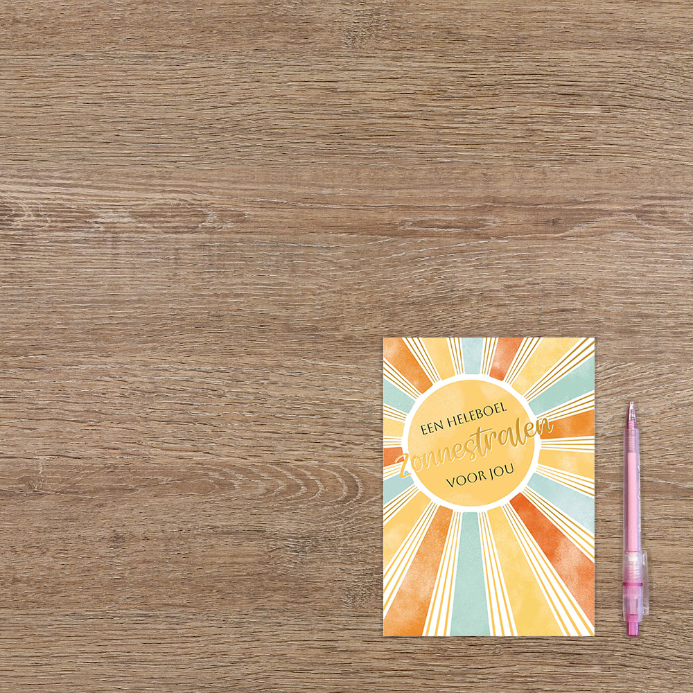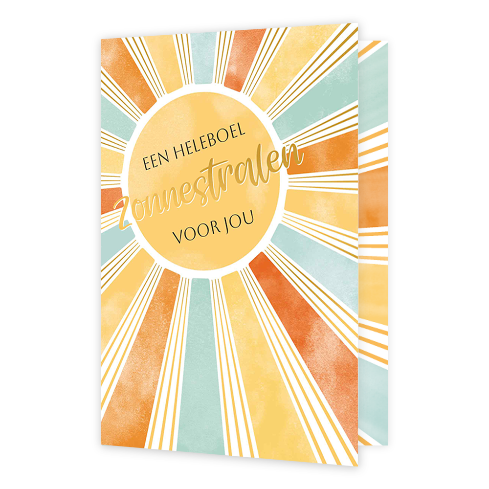 De wenskaart heeft een afmeting van x en een staande vorm. Op deze wenskaart staan zonnestralen in de kleuren mintgroen, oranje, gel en goud met in het midden een gele cirkel met de tekst: "Een heleboel zonnestralen voor jou". De binnenzijde van de wenskaart is bedrukt met een ontwerp passend bij de voorzijde van de kaart .