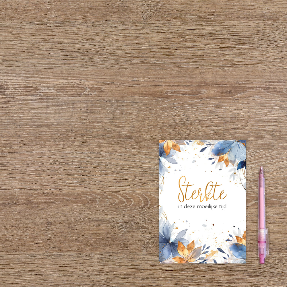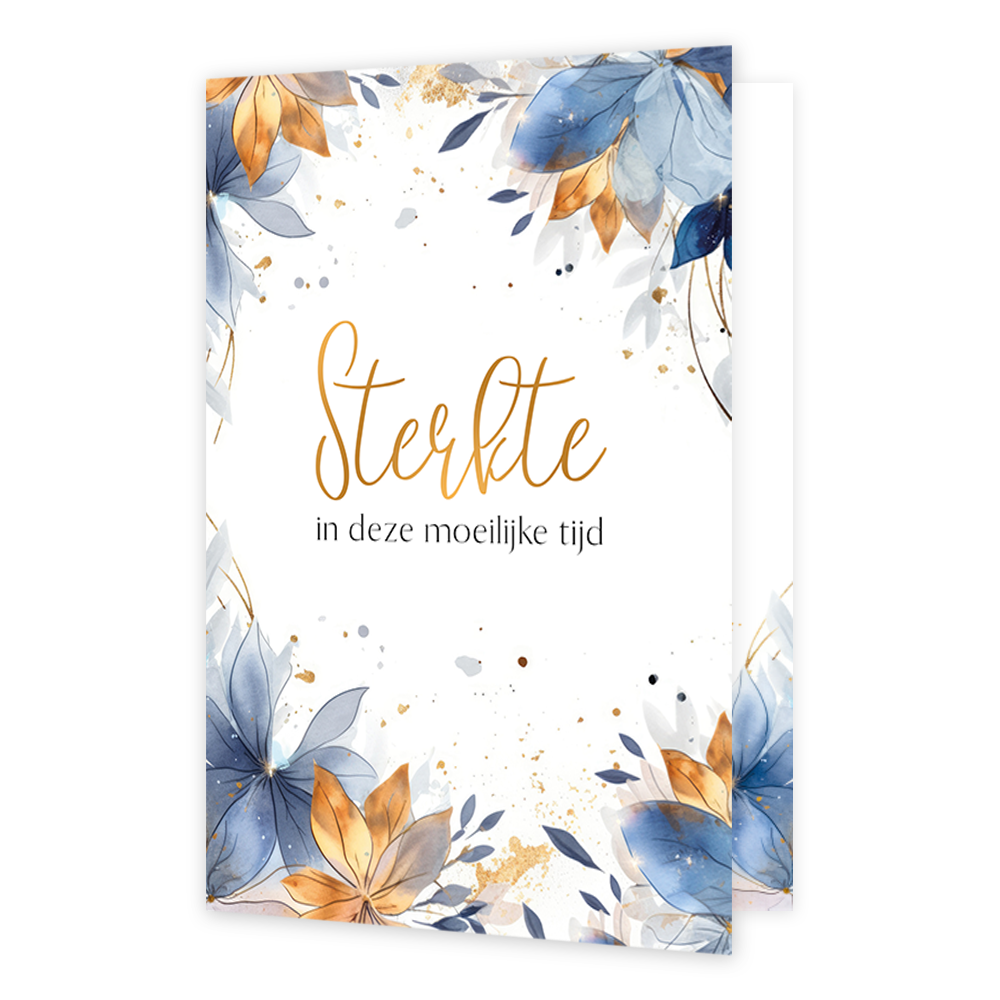 De wenskaart heeft een afmeting van x en een staande vorm. Op deze wenskaart staan bloemen in de kleuren blauw en geel met in het midden de tekst: "Sterkte in deze moeilijke tijd". De binnenzijde van de wenskaart is bedrukt met een ontwerp passend bij de voorzijde van de kaart .