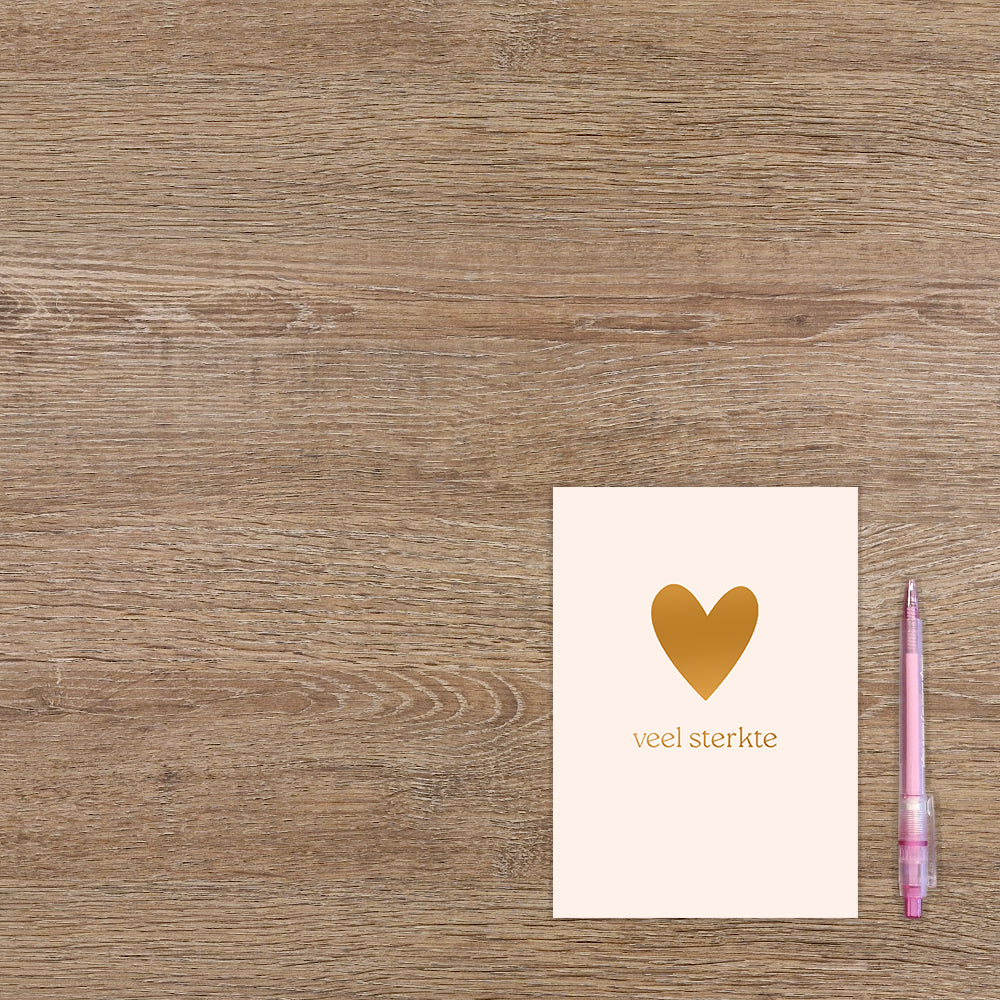 De wenskaart heeft een afmeting van x en een staande vorm. Op deze wenskaart staat een hart in het goud op een witte achtergrond met de tekst: "Veel sterkte". De binnenzijde van de wenskaart is bedrukt met een ontwerp passend bij de voorzijde van de kaart .