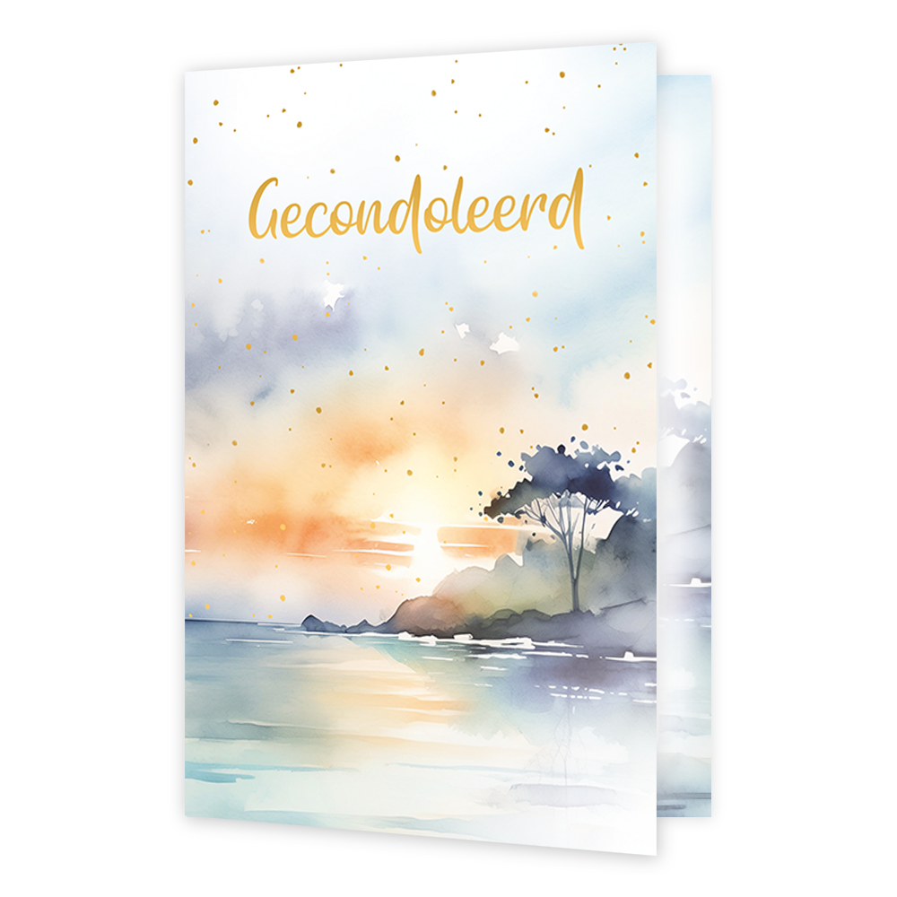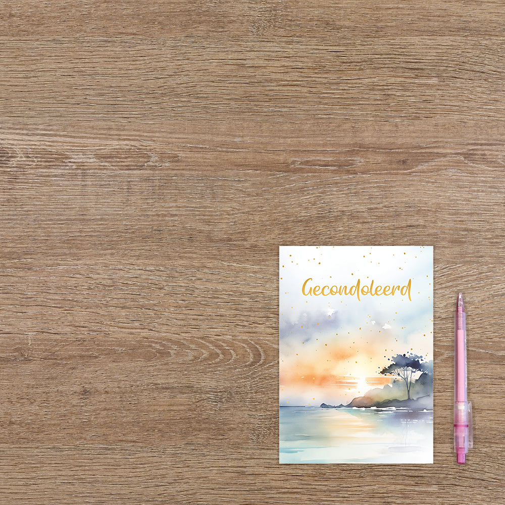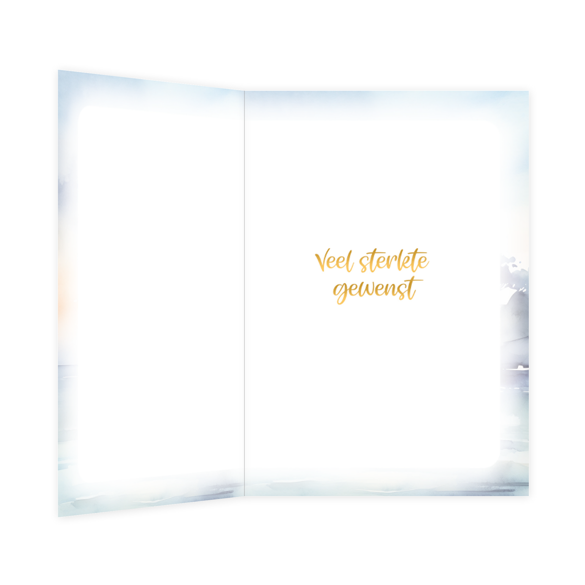 De wenskaart heeft een afmeting van x en een staande vorm. Op deze wenskaart staat een eiland met een ondergaande zon. Boven in de illustratie staat de tekst: "Gecondoleerd". De binnenzijde van de wenskaart is bedrukt met een ontwerp passend bij de voorzijde van de kaart en de tekst "Veel sterkte gewenst".