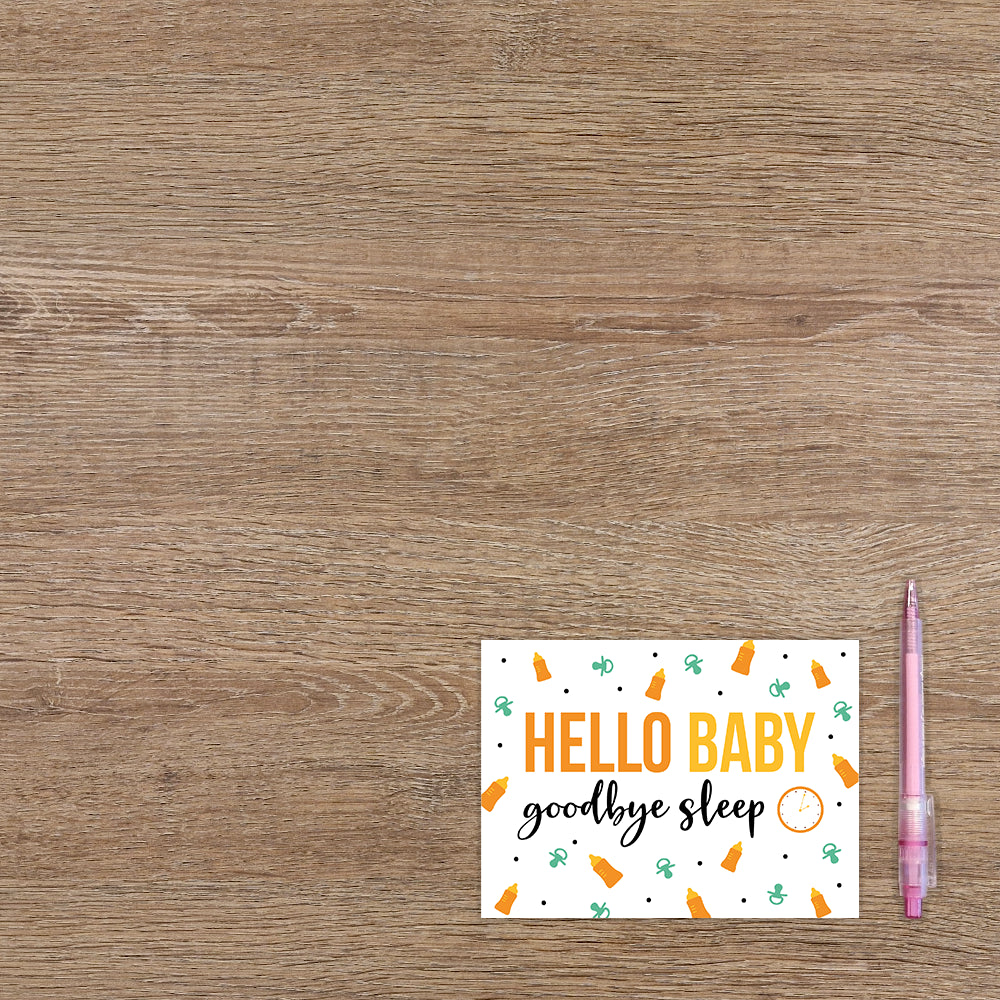 De wenskaart heeft een afmeting van x en een liggende vorm. Op deze wenskaart staan babyflesjes en speentjes met in het midden de tekst: "Hello baby goodbye sleep". De binnenzijde van de wenskaart is blanco wat voldoende ruimte geeft om een persoonlijke boodschap te schrijven .