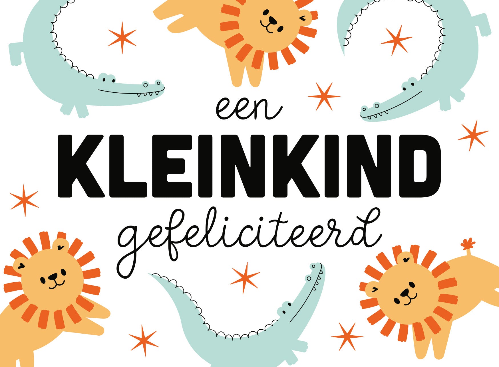 De wenskaart heeft een afmeting van x en een liggende vorm. Op deze wenskaart staan krokodillen en leeuwen met in het midden de tekst: "Een kleinkind gefeliciteerd". De binnenzijde van de wenskaart is blanco wat voldoende ruimte geeft om een persoonlijke boodschap te schrijven .