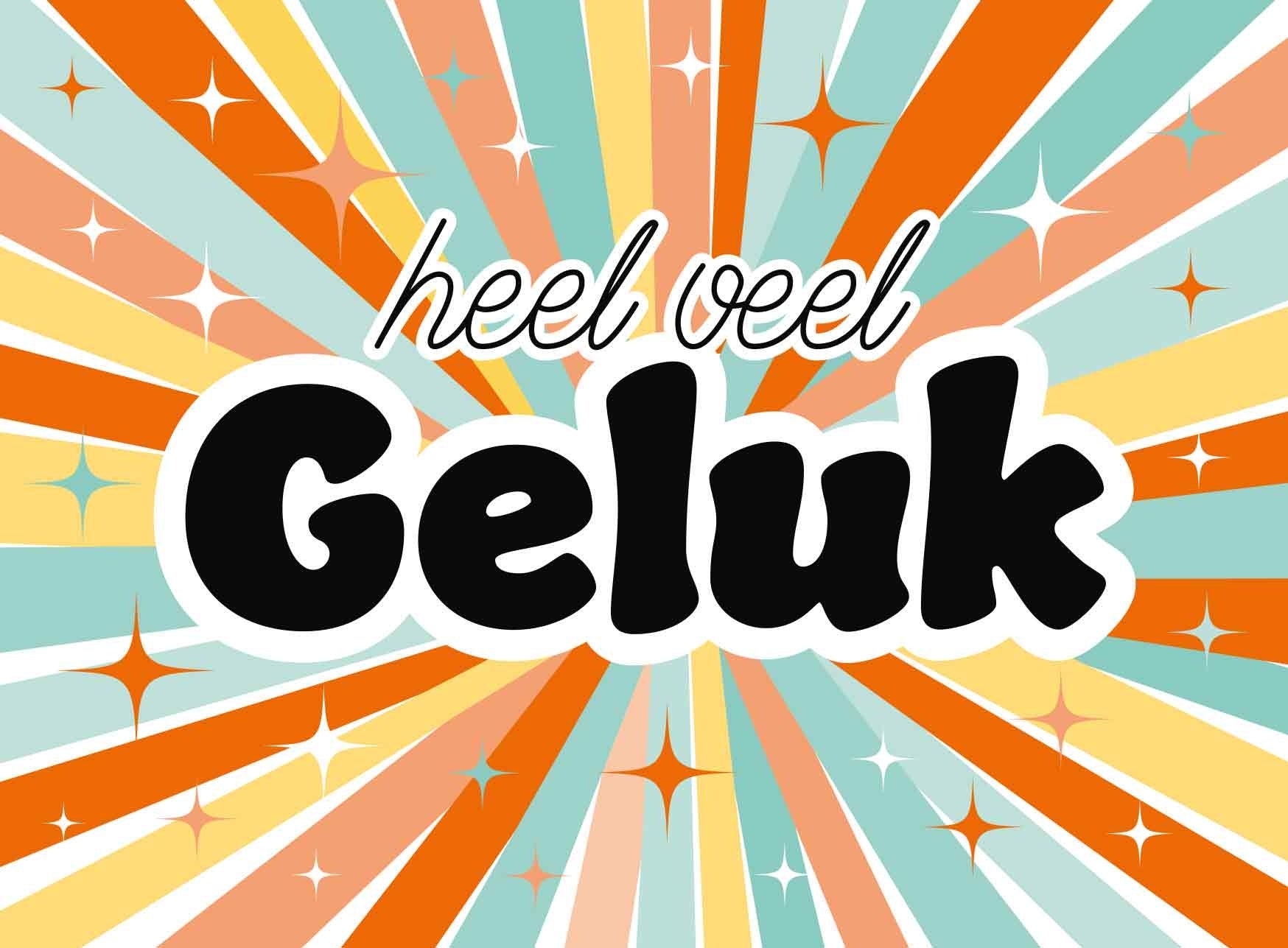 De wenskaart heeft een afmeting van x en een liggende vorm. Op deze wenskaart staan lijnen in de kleuren oranje, geel, beige, wit en mintgroen, omringt door sterren in dezelfde kleuren. In het midden staat de tekst: "Heel veel geluk". De binnenzijde van de wenskaart is blanco wat voldoende ruimte geeft om een persoonlijke boodschap te schrijven .