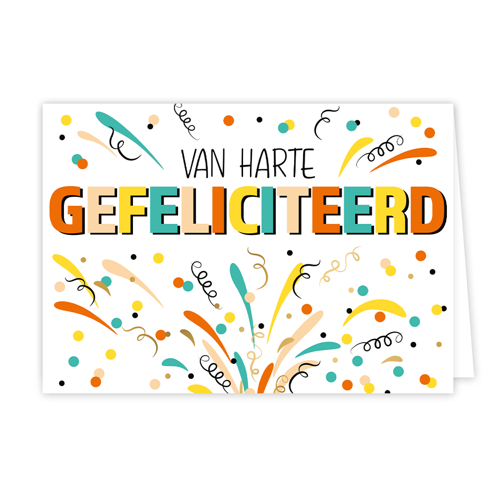 De wenskaart heeft een afmeting van x en een liggende vorm. Op deze wenskaart staan slingers en confetti in de kleuren geel, beige, rood en mintgroen. Bovenin staat de tekst: "Van harte gefeliciteerd". De binnenzijde van de wenskaart is blanco wat voldoende ruimte geeft om een persoonlijke boodschap te schrijven .