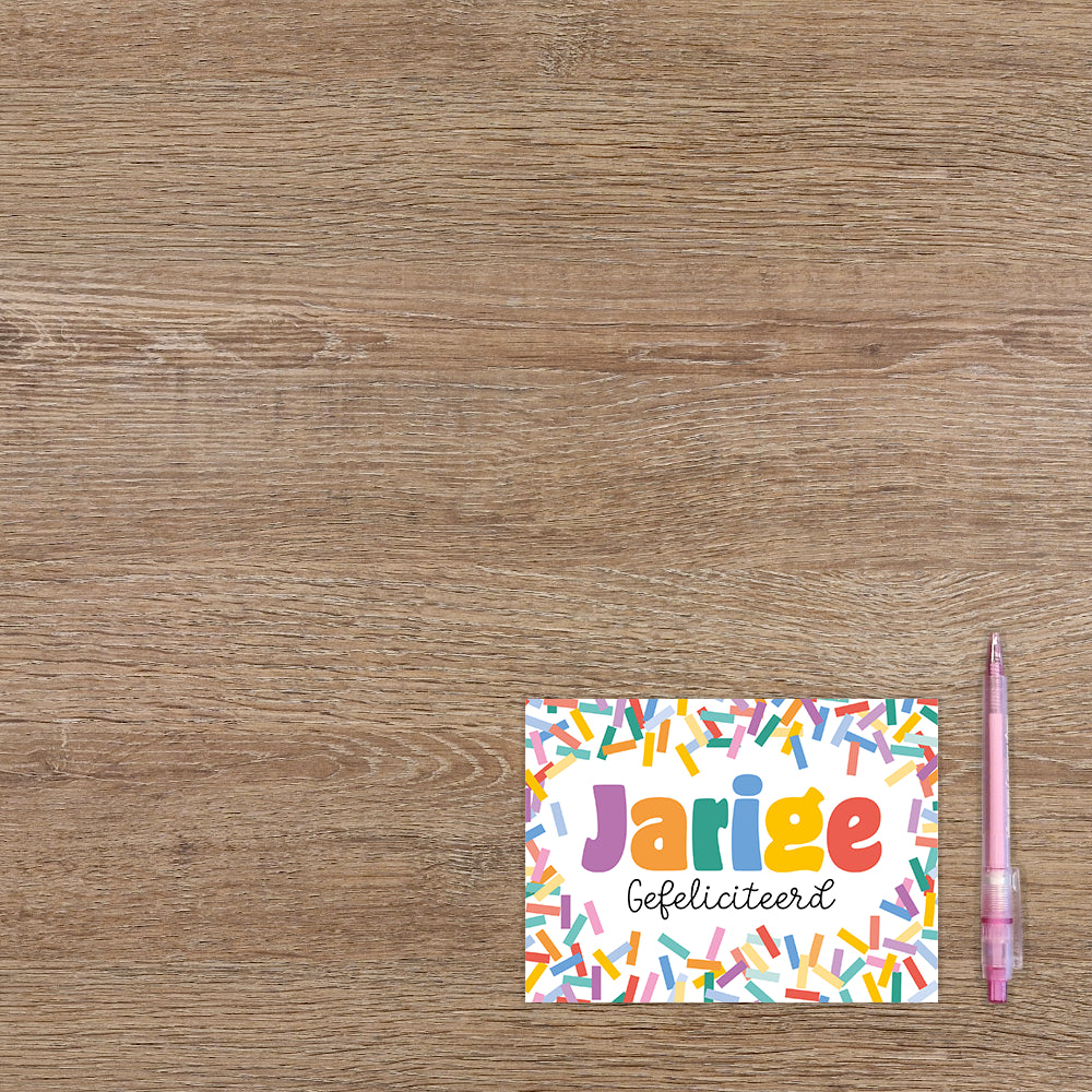 De wenskaart heeft een afmeting van x en een liggende vorm. Op deze wenskaart staat confetti in de kleuren geel, groen, paars, blauw, oranje en rood. In het midden staat de tekst: "Jarige gefeliciteerd". De binnenzijde van de wenskaart is blanco wat voldoende ruimte geeft om een persoonlijke boodschap te schrijven .