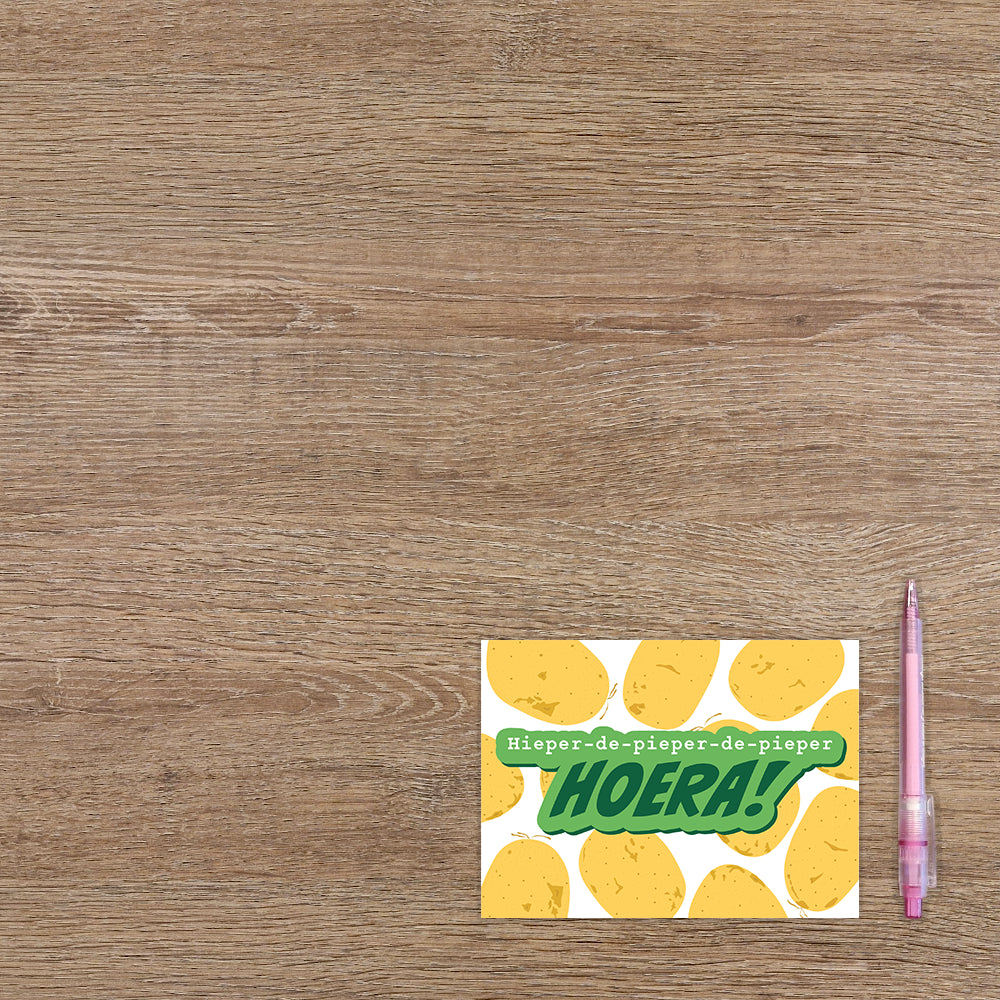 De wenskaart heeft een afmeting van x en een liggende vorm. Op deze wenskaart staan aardappelen met in het midden de tekst: "Hieper-de-pieper-de-pieper hoera!". De binnenzijde van de wenskaart is blanco wat voldoende ruimte geeft om een persoonlijke boodschap te schrijven .