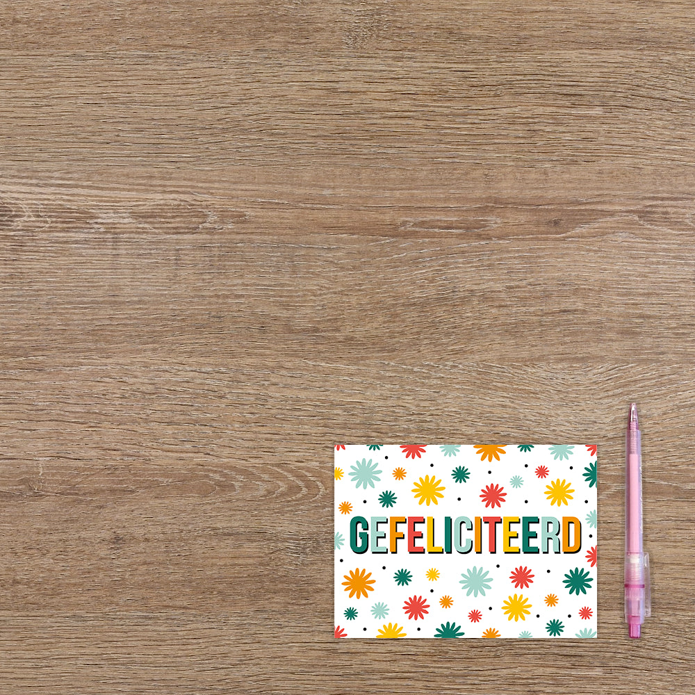 De wenskaart heeft een afmeting van x en een liggende vorm. Op deze wenskaart staan bloemen i de kleuren geel, oranje, rood en groen met in het midden de tekst: "Gefeliciteerd". De binnenzijde van de wenskaart is blanco wat voldoende ruimte geeft om een persoonlijke boodschap te schrijven .