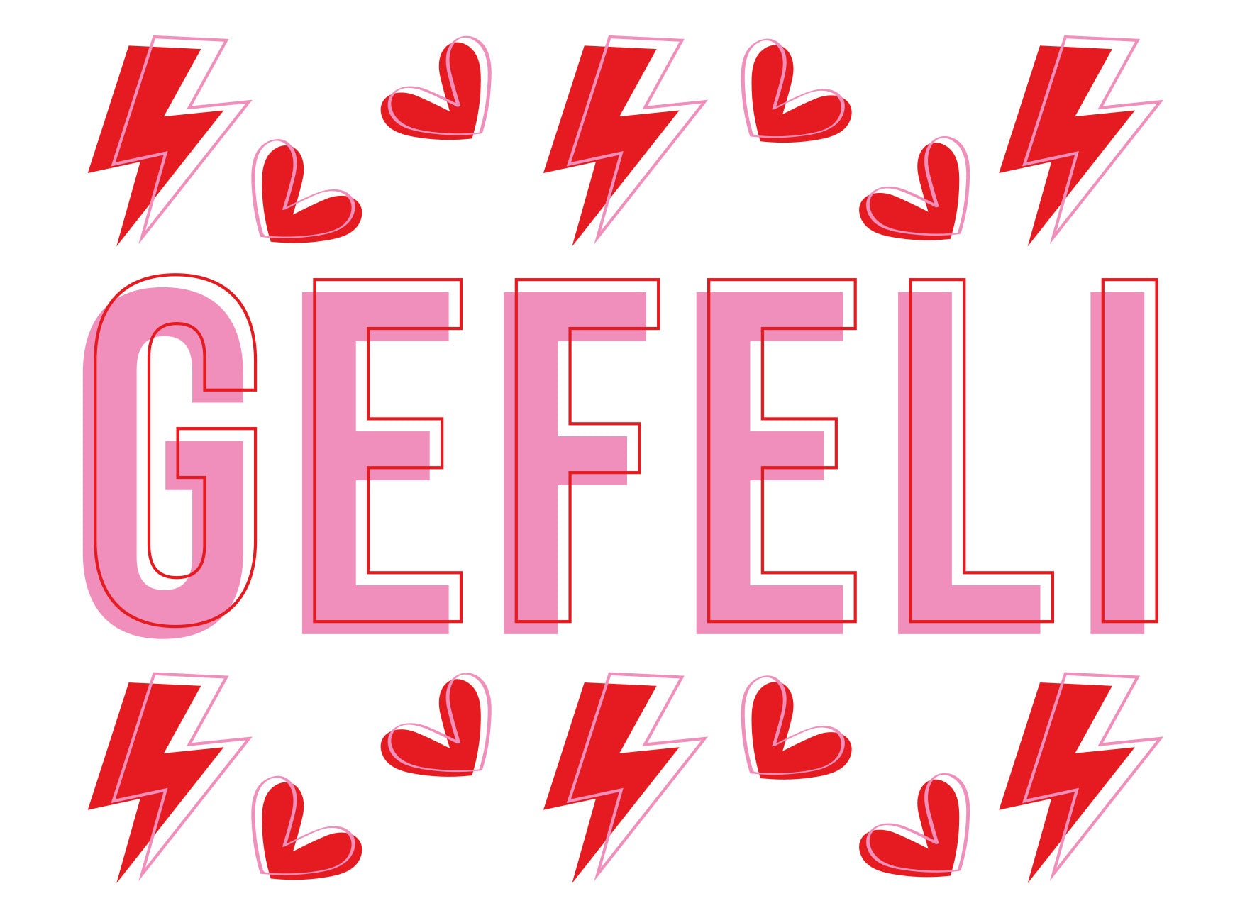 De wenskaart heeft een afmeting van x en een liggende vorm. Op deze wenskaart staat de tekst: "Gefeli" omringt door rode hartjes en bliksem. De binnenzijde van de wenskaart is blanco wat voldoende ruimte geeft om een persoonlijke boodschap te schrijven .