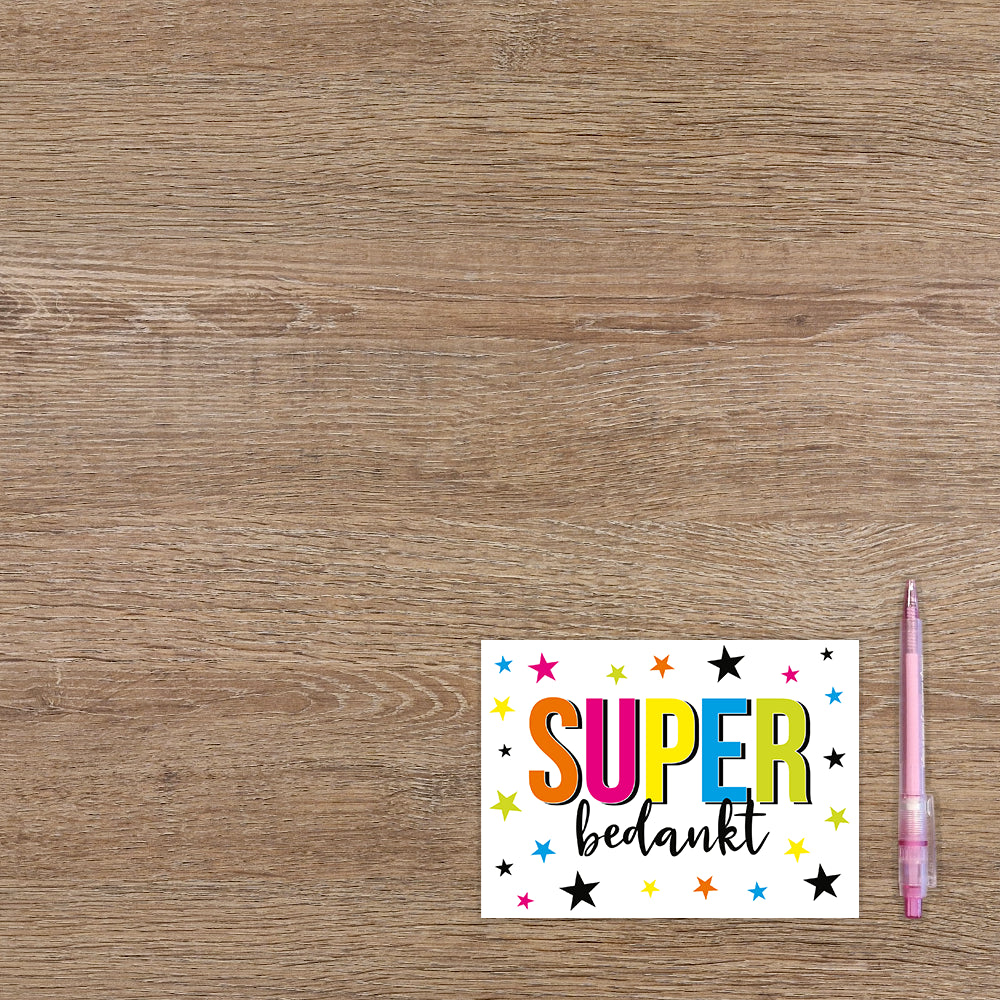 De wenskaart heeft een afmeting van x en een liggende vorm. Op deze wenskaart staan sterren in de kleuren roze, groen, oranje, zwart, blauw, groen en geel. In het midden staat de tekst: "Super bedankt". De binnenzijde van de wenskaart is blanco wat voldoende ruimte geeft om een persoonlijke boodschap te schrijven .