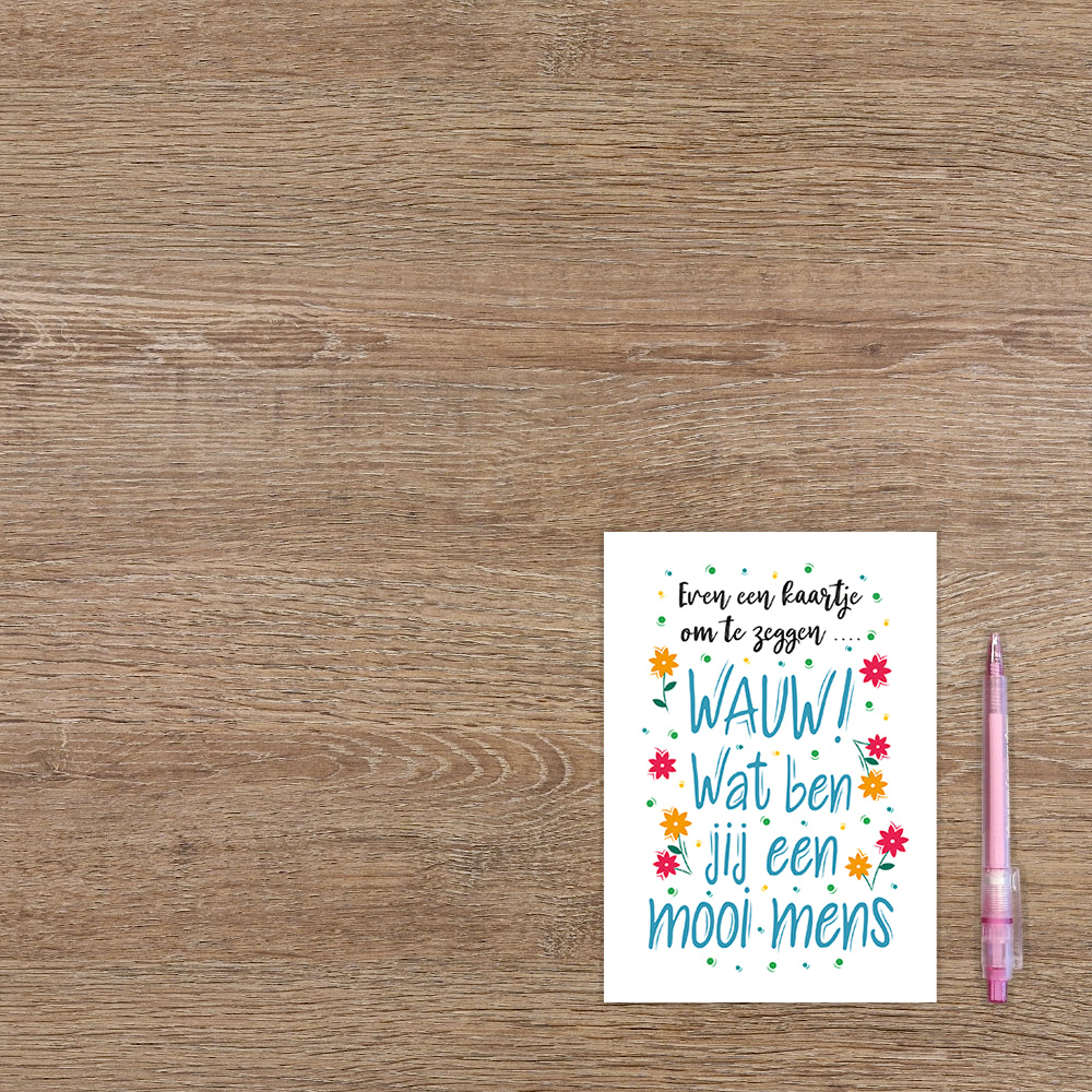 De wenskaart heeft een afmeting van x en een staande vorm. Op deze wenskaart staan bloemen en stippen in de kleuren groen, blauw, rood, oranje en geel. In het midden staat de tekst: "Wauw! Wat ben jij een mooi mens". De binnenzijde van de wenskaart is blanco wat voldoende ruimte geeft om een persoonlijke boodschap te schrijven .