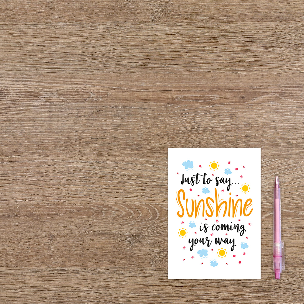 De wenskaart heeft een afmeting van x en een staande vorm. Op deze wenskaart staan wolken, zonnetjes en stippen in de kleuren blauw, rood en geel. In het midden staat de tekst: "Just to say... sunshine is coming your way". De binnenzijde van de wenskaart is blanco wat voldoende ruimte geeft om een persoonlijke boodschap te schrijven .