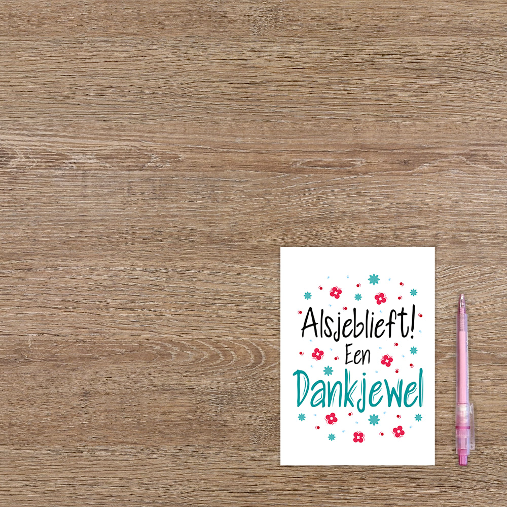 De wenskaart heeft een afmeting van x en een staande vorm. Op deze wenskaart staan bloemen in de kleuren rood en blauw. In het midden staat de tekst: "Alsjeblieft! Een dank je wel". De binnenzijde van de wenskaart is blanco wat voldoende ruimte geeft om een persoonlijke boodschap te schrijven .
