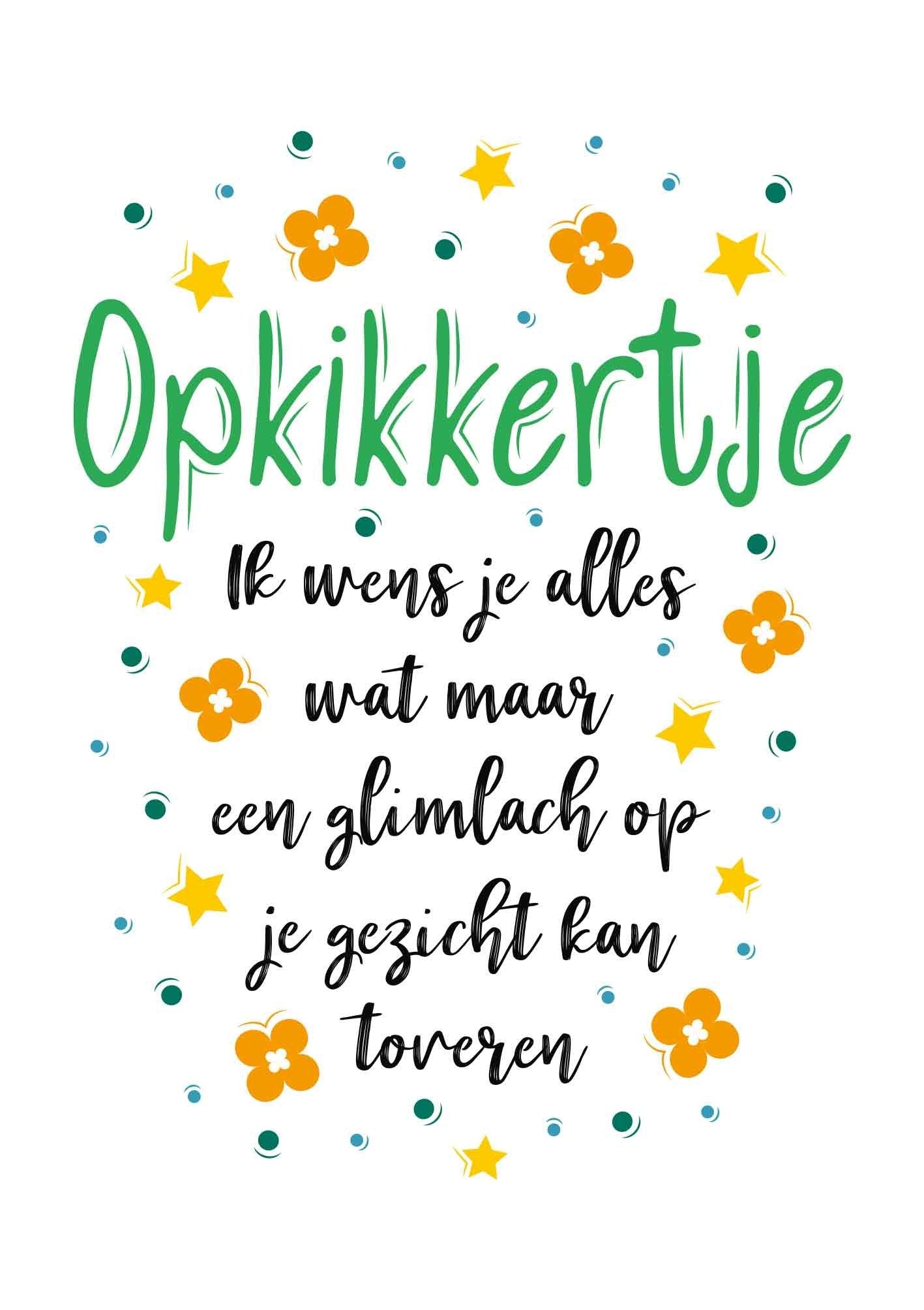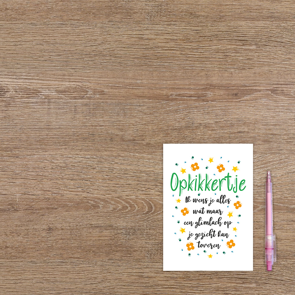 De wenskaart heeft een afmeting van x en een staande vorm. Op deze wenskaart staan bloemen, stippen en sterren in de kleuren groen, blauw, geel en oranje. In het midden staat de tekst: "Opkikkertje. Ik wens je alles wat maar een glimlach op je gezicht kan toveren". De binnenzijde van de wenskaart is blanco wat voldoende ruimte geeft om een persoonlijke boodschap te schrijven .