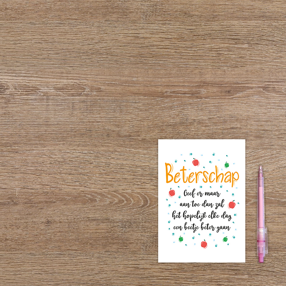 De wenskaart heeft een afmeting van x en een staande vorm. Op deze wenskaart staan stippen en appels in de kleuren groen, rood en blauw. In het midden staat de tekst: "Beterschap. Geef er maar aan toe dan zal het hopelijk elke dag een beetje beter gaan". De binnenzijde van de wenskaart is blanco wat voldoende ruimte geeft om een persoonlijke boodschap te schrijven .