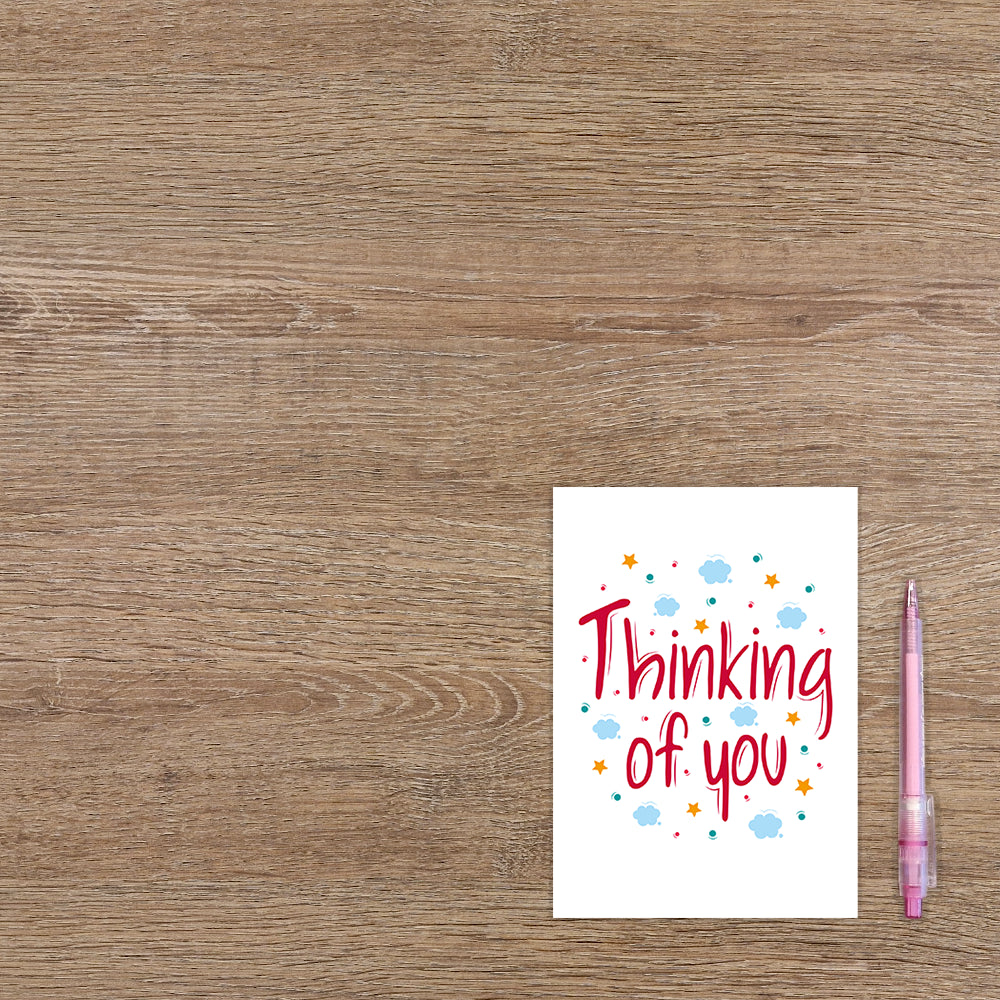 De wenskaart heeft een afmeting van x en een staande vorm. Op deze wenskaart staan wolken, sterren en stippen in de kleuren oranje, rood en blauw. In het midden staat de tekst: "Thinking of you". De binnenzijde van de wenskaart is blanco wat voldoende ruimte geeft om een persoonlijke boodschap te schrijven .