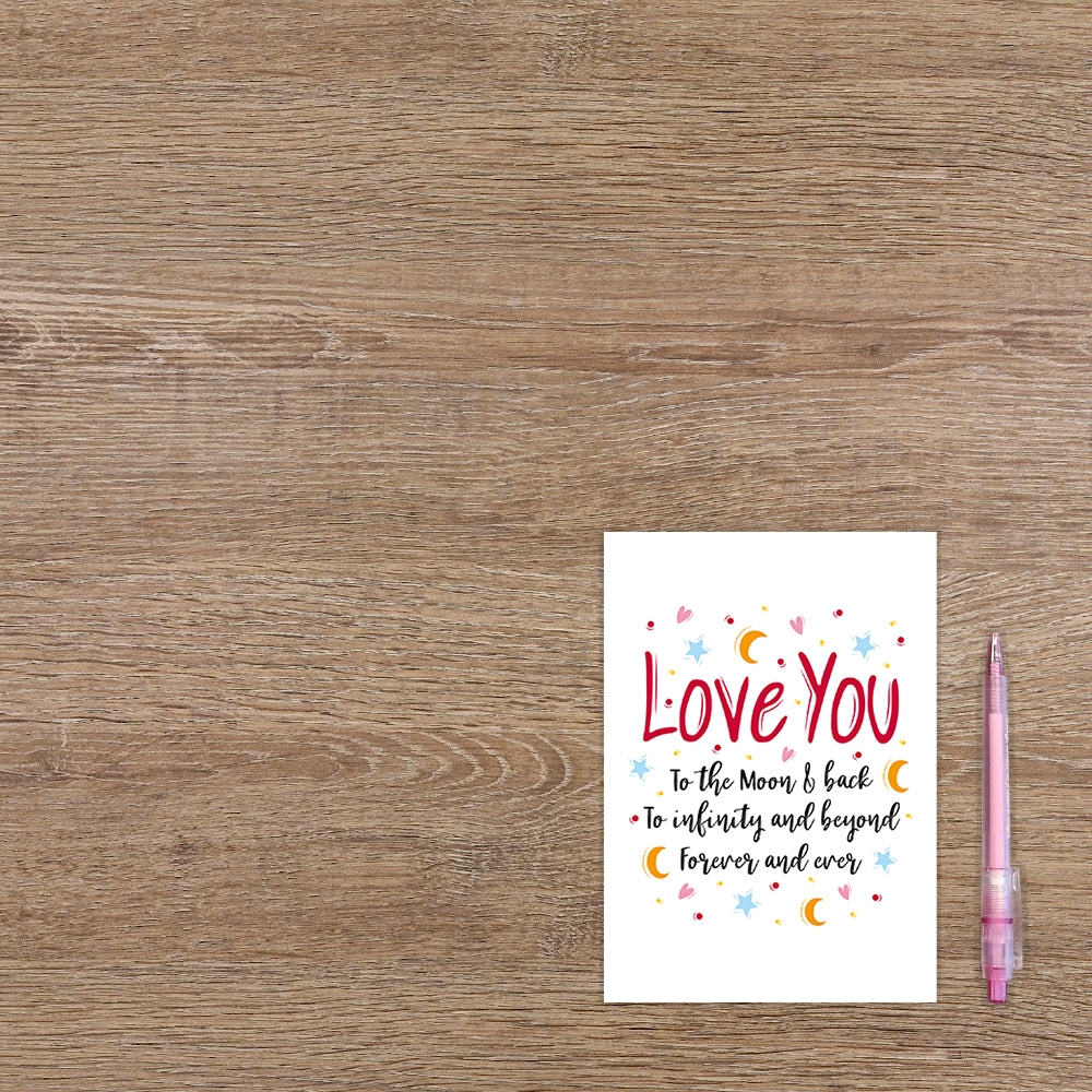 De wenskaart heeft een afmeting van x en een staande vorm. Op deze wenskaart staan hartjes, sterren en halve manen in de kleuren roze, blauw, geel, rood en oranje. In het midden staat de tekst: "Love you to the moon & back. To infinity and beyond. Forever and ever". De binnenzijde van de wenskaart is blanco wat voldoende ruimte geeft om een persoonlijke boodschap te schrijven .