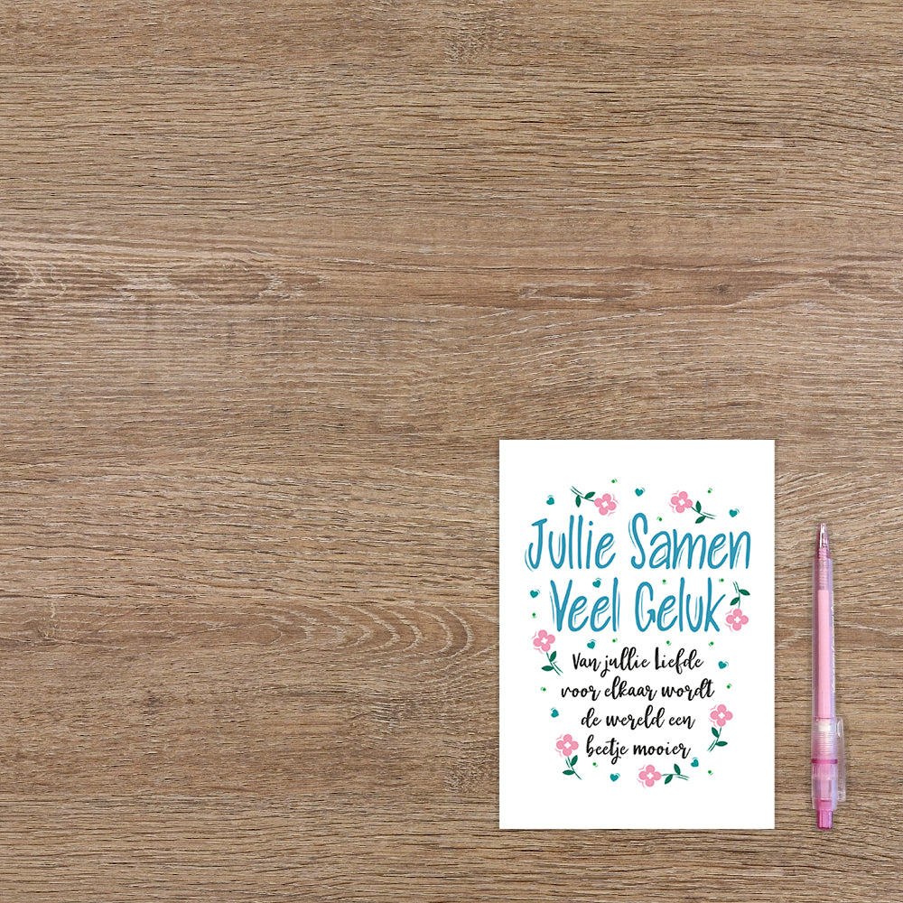 De wenskaart heeft een afmeting van x en een staande vorm. Op deze wenskaart staan roze bloemen en blauwe hartjes. In het midden staat de tekst: "Jullie samen veel geluk van jullie liefde voor elkaar wordt de wereld een beetje mooier". De binnenzijde van de wenskaart is blanco wat voldoende ruimte geeft om een persoonlijke boodschap te schrijven .