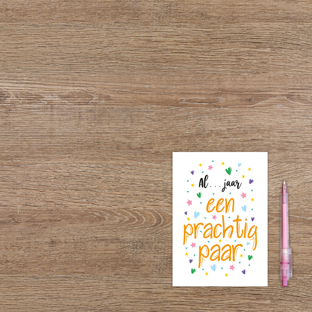 De wenskaart heeft een afmeting van x en een staande vorm. Op deze wenskaart staan hartjes, sterren en stippen in de kleuren groen, paars, blauw, geel en roze. In het midden staat de tekst: "Al ... jaar een prachtig paar". De binnenzijde van de wenskaart is blanco wat voldoende ruimte geeft om een persoonlijke boodschap te schrijven .