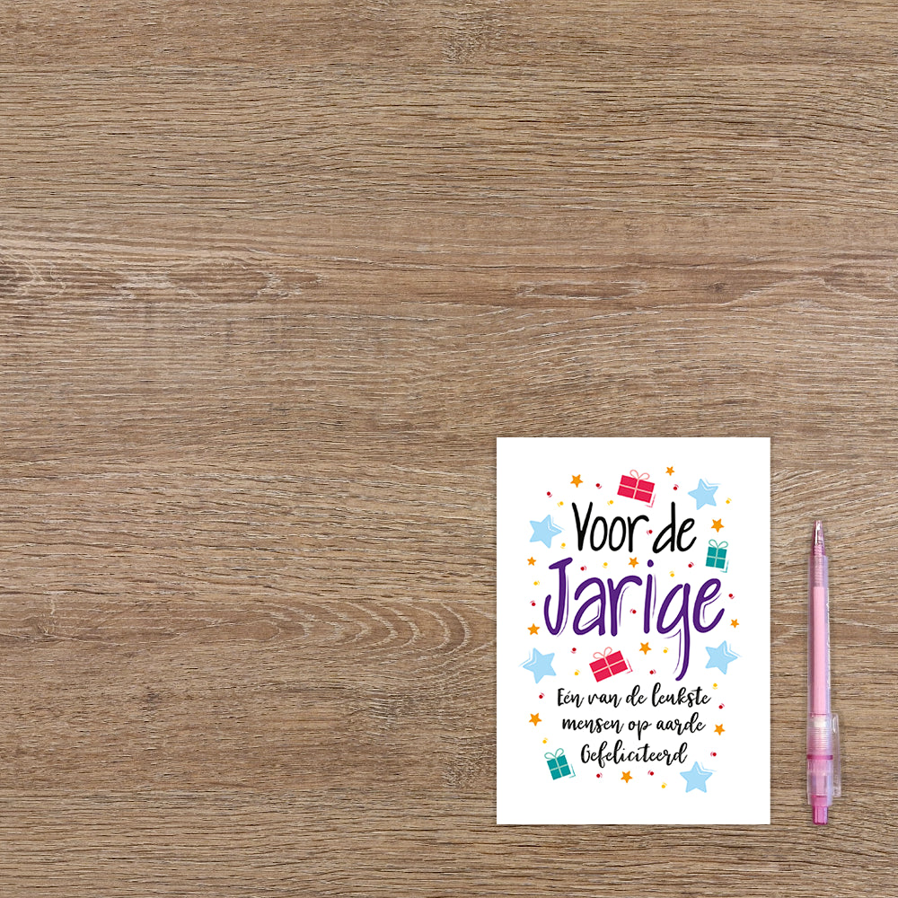 De wenskaart heeft een afmeting van x en een staande vorm. Op deze wenskaart staan sterren en cadeautjes in de kleuren blauw, rood, groen geel en oranje. In het midden staat de tekst: "Voor de jarige. Eén van de leukste mensen op aarde, gefeliciteerd". De binnenzijde van de wenskaart is blanco wat voldoende ruimte geeft om een persoonlijke boodschap te schrijven .