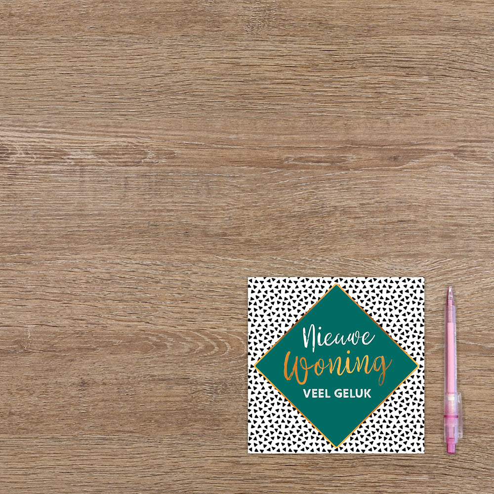 De wenskaart heeft een afmeting van x en een vierkante vorm. Op deze wenskaart staan zwarte driehoeken met in het midden een groene ruit met gouden omlijning. In het midden staat de tekst: "Nieuwe woning veel geluk". De binnenzijde van de wenskaart is blanco wat voldoende ruimte geeft om een persoonlijke boodschap te schrijven .