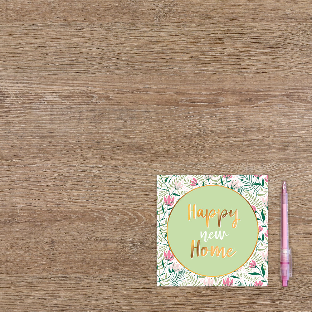 De wenskaart heeft een afmeting van x en een vierkante vorm. Op deze wenskaart staan roze bloemen met groene bladeren. In het midden staat een groene crikel met gouden omlijning en in het midden de tekst: "Happy new home". De binnenzijde van de wenskaart is blanco wat voldoende ruimte geeft om een persoonlijke boodschap te schrijven .