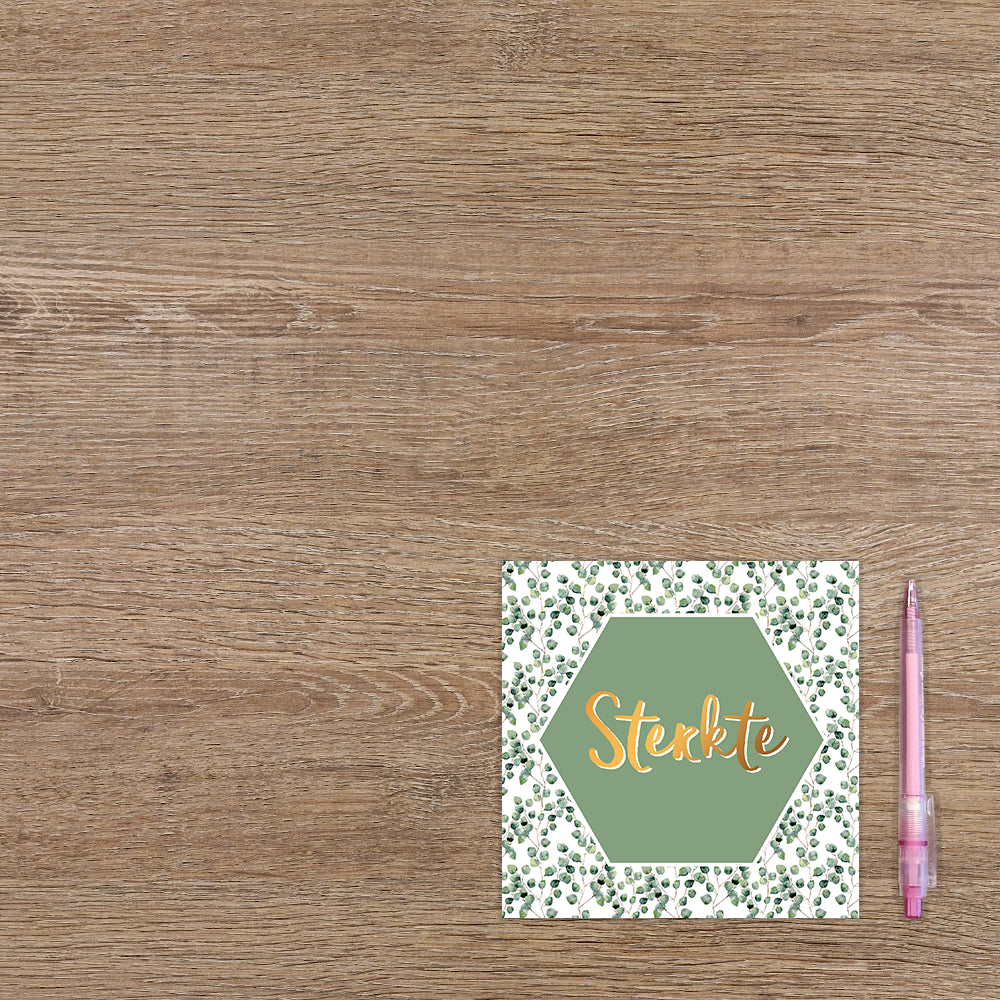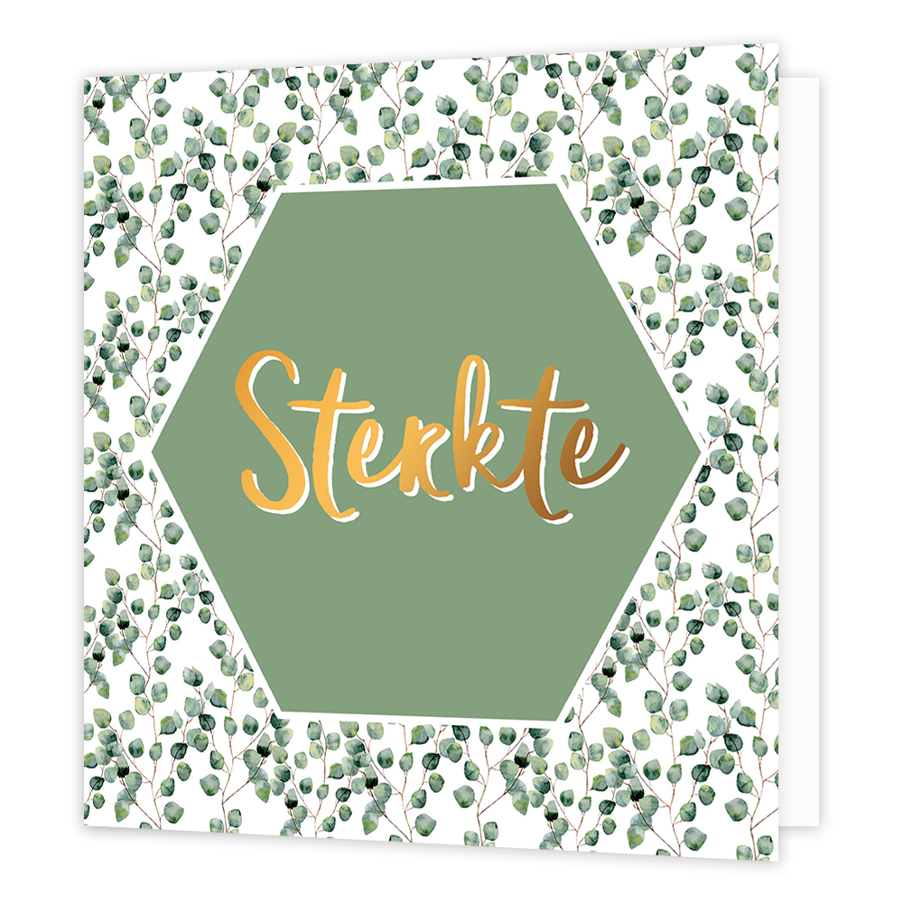 De wenskaart heeft een afmeting van x en een vierkante vorm. Op deze wenskaart staan groene bladeren met een groene zeshoek in het midden en de tekst: "Sterkte". De binnenzijde van de wenskaart is blanco wat voldoende ruimte geeft om een persoonlijke boodschap te schrijven .