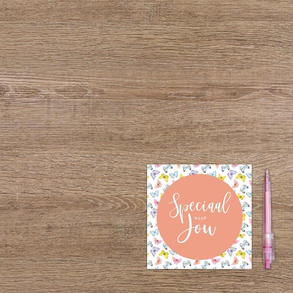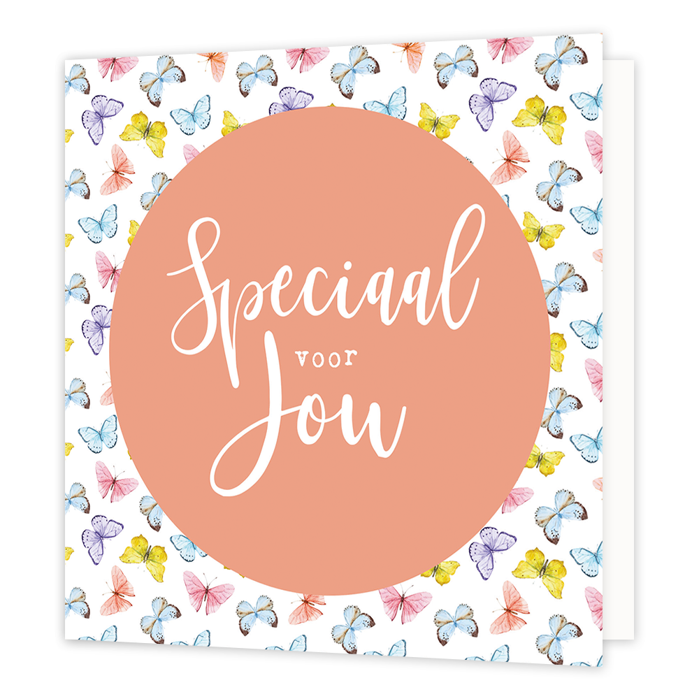 De wenskaart heeft een afmeting van x en een vierkante vorm. Op deze wenskaart staan vlinders in diverse kleuren met in het midden een oranje cirkel en de tekst: "Speciaal voor jou". De binnenzijde van de wenskaart is blanco wat voldoende ruimte geeft om een persoonlijke boodschap te schrijven .
