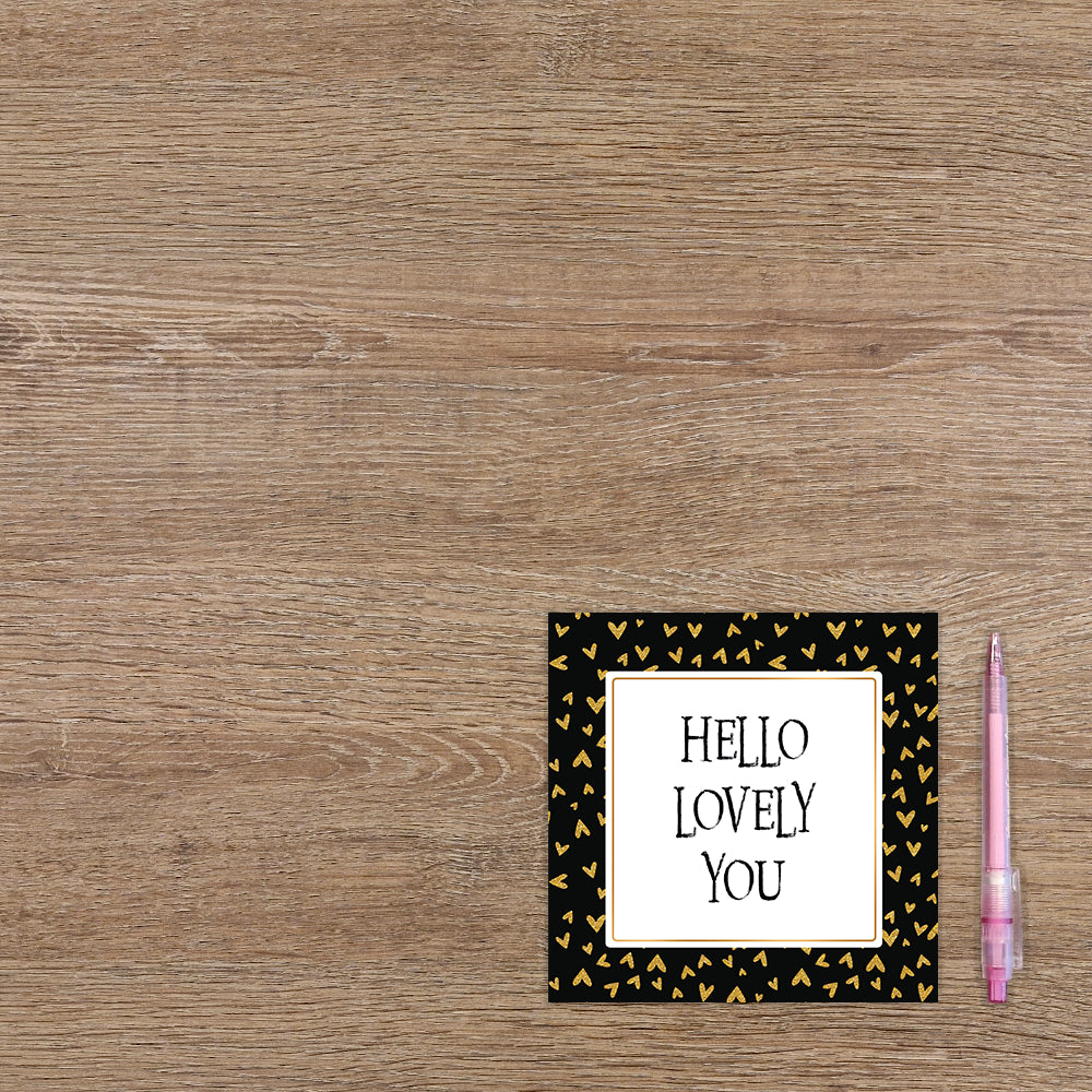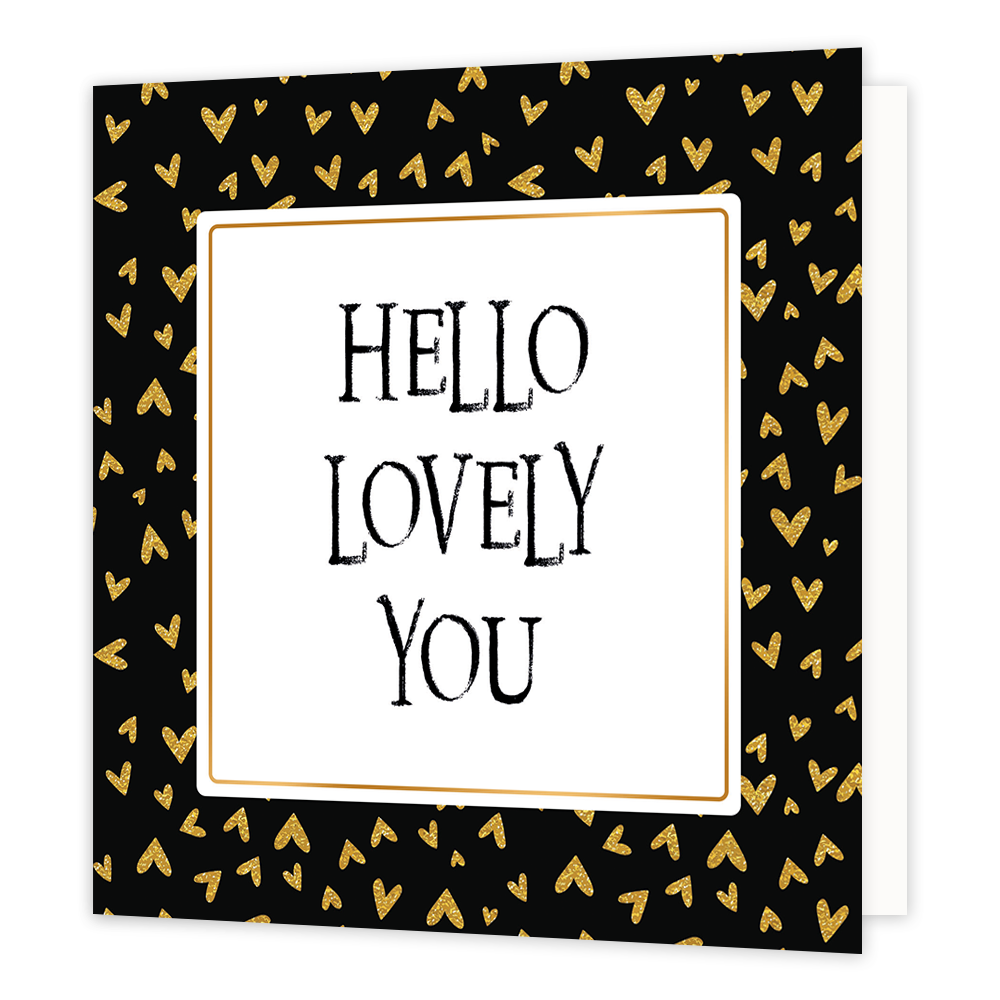 De wenskaart heeft een afmeting van x en een vierkante vorm. Op deze wenskaart staan gouden hartjes met in het midden een wit vierkant met gouden omlijning en de tekst: "Hello lovely you". De binnenzijde van de wenskaart is blanco wat voldoende ruimte geeft om een persoonlijke boodschap te schrijven .