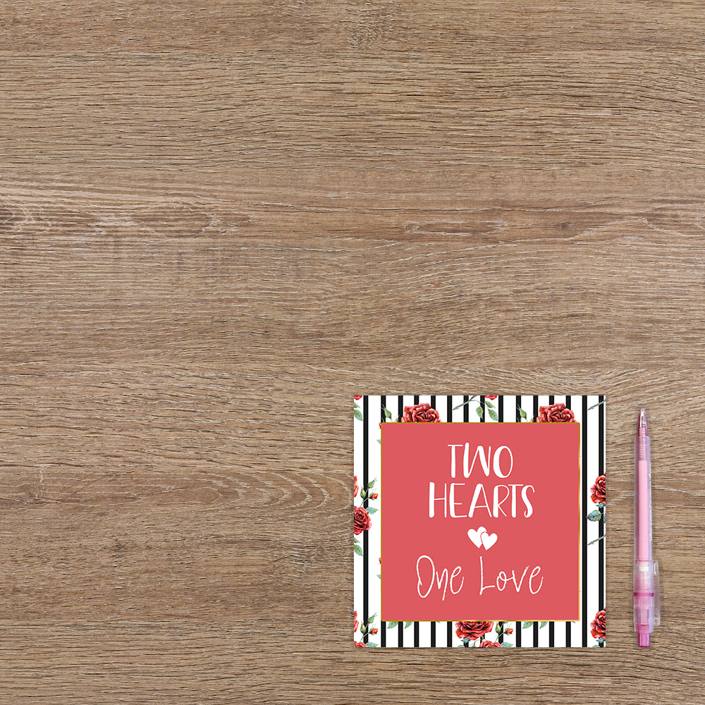 De wenskaart heeft een afmeting van x en een vierkante vorm. Op deze wenskaart staan zwarte lijnen met rode rozen. In het midden staat een rode vierkant met gouden omlijning en de tekst: "Two hearts one love". De binnenzijde van de wenskaart is blanco wat voldoende ruimte geeft om een persoonlijke boodschap te schrijven .