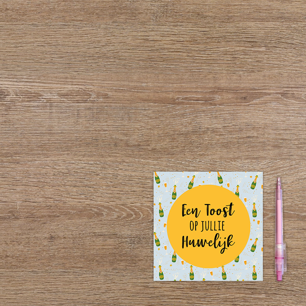 De wenskaart heeft een afmeting van x en een vierkante vorm. Op deze wenskaart staan champagneflessen en champagneglaze. In het midden staat een gele cirkel met de tekst: "Een toost op jullie huwelijk". De binnenzijde van de wenskaart is blanco wat voldoende ruimte geeft om een persoonlijke boodschap te schrijven .