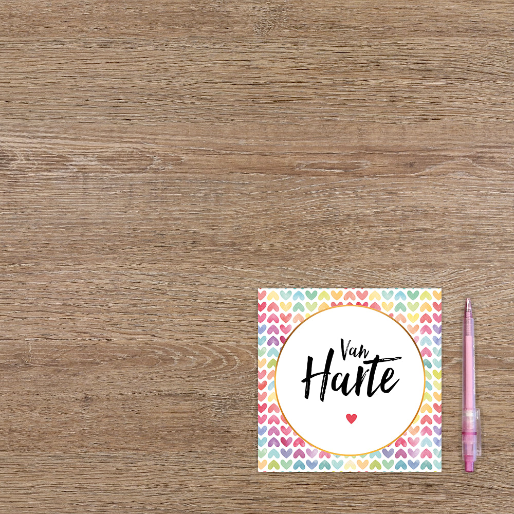 De wenskaart heeft een afmeting van x en een vierkante vorm. Op deze wenskaart staan hartjes in diverse kleuren met in het midden een witte cirkel met gouden omlijning en de tekst: "Van harte". De binnenzijde van de wenskaart is blanco wat voldoende ruimte geeft om een persoonlijke boodschap te schrijven .