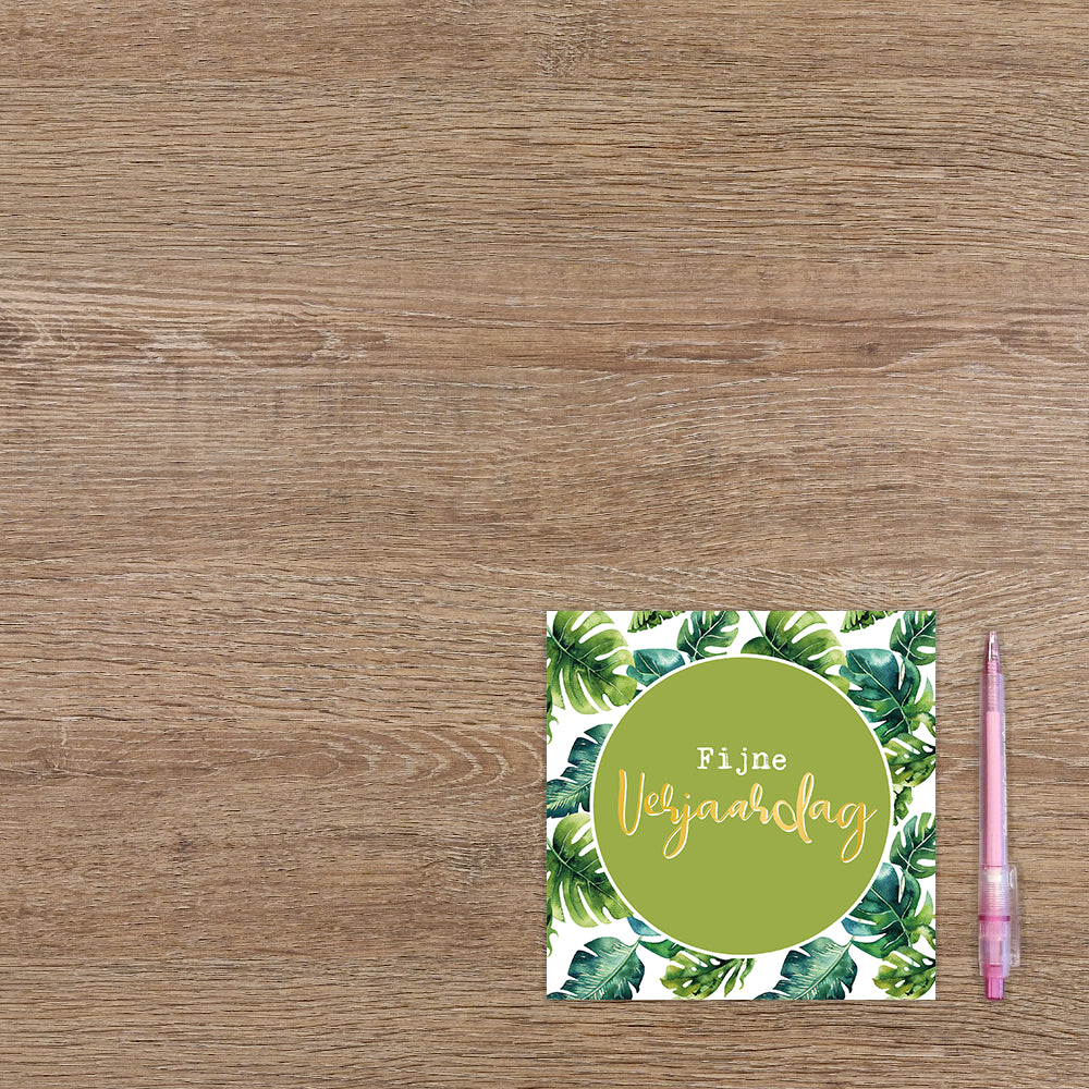 De wenskaart heeft een afmeting van x en een vierkante vorm. Op deze wenskaart staan groene bladeren met in het midden een groene cirkel met de tekst: "Fijne verjaardag". De binnenzijde van de wenskaart is blanco wat voldoende ruimte geeft om een persoonlijke boodschap te schrijven .