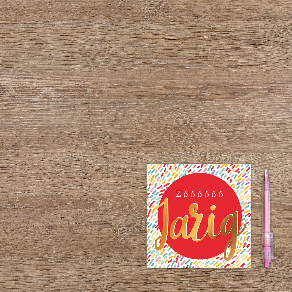 De wenskaart heeft een afmeting van x en een vierkante vorm. Op deze wenskaart staat confetti in diverse kleuren met in het midden een rode cirkel met de tekst: "Zóóóóóó jarig". De binnenzijde van de wenskaart is blanco wat voldoende ruimte geeft om een persoonlijke boodschap te schrijven .