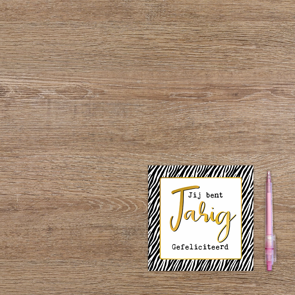De wenskaart heeft een afmeting van x en een vierkante vorm. Op deze wenskaart staan zwarte en witte lijnen met in het midden een witte vierkant met gouden omlijning en de tekst: "Jij bent jarig gefeliciteerd". De binnenzijde van de wenskaart is blanco wat voldoende ruimte geeft om een persoonlijke boodschap te schrijven .