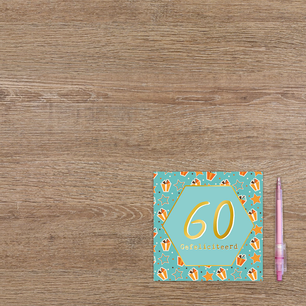 De wenskaart heeft een afmeting van x en een vierkante vorm. Op deze wenskaart staan cadeautjes en sterren met in het midden een mintgroene zeshoek met gouden omlijning en de tekst: "60 gefeliciteerd". De binnenzijde van de wenskaart is blanco wat voldoende ruimte geeft om een persoonlijke boodschap te schrijven .