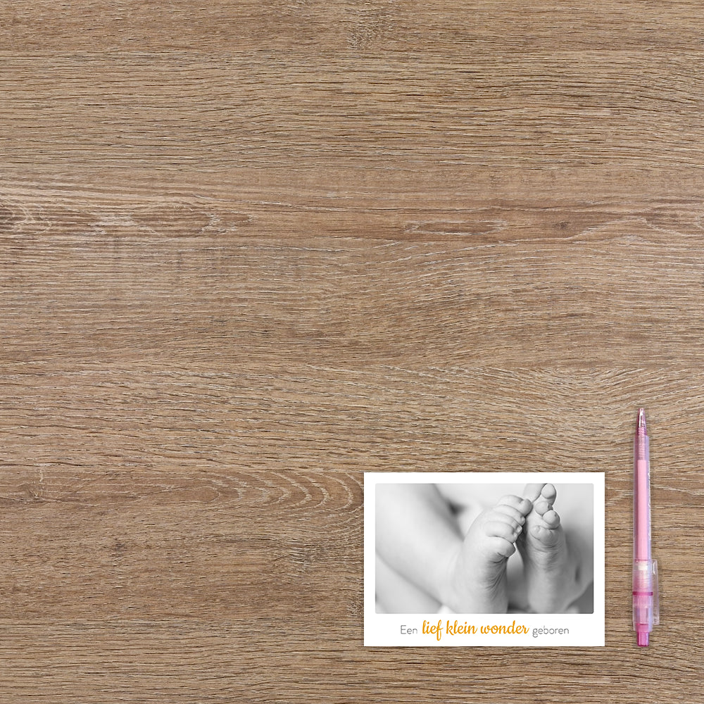 De wenskaart heeft een afmeting van x en een liggende vorm. Op deze wenskaart staan kindervoetjes met daaronder de tekst: "Een lief klein wonder geboren". De binnenzijde van de wenskaart is blanco wat voldoende ruimte geeft om een persoonlijke boodschap te schrijven .