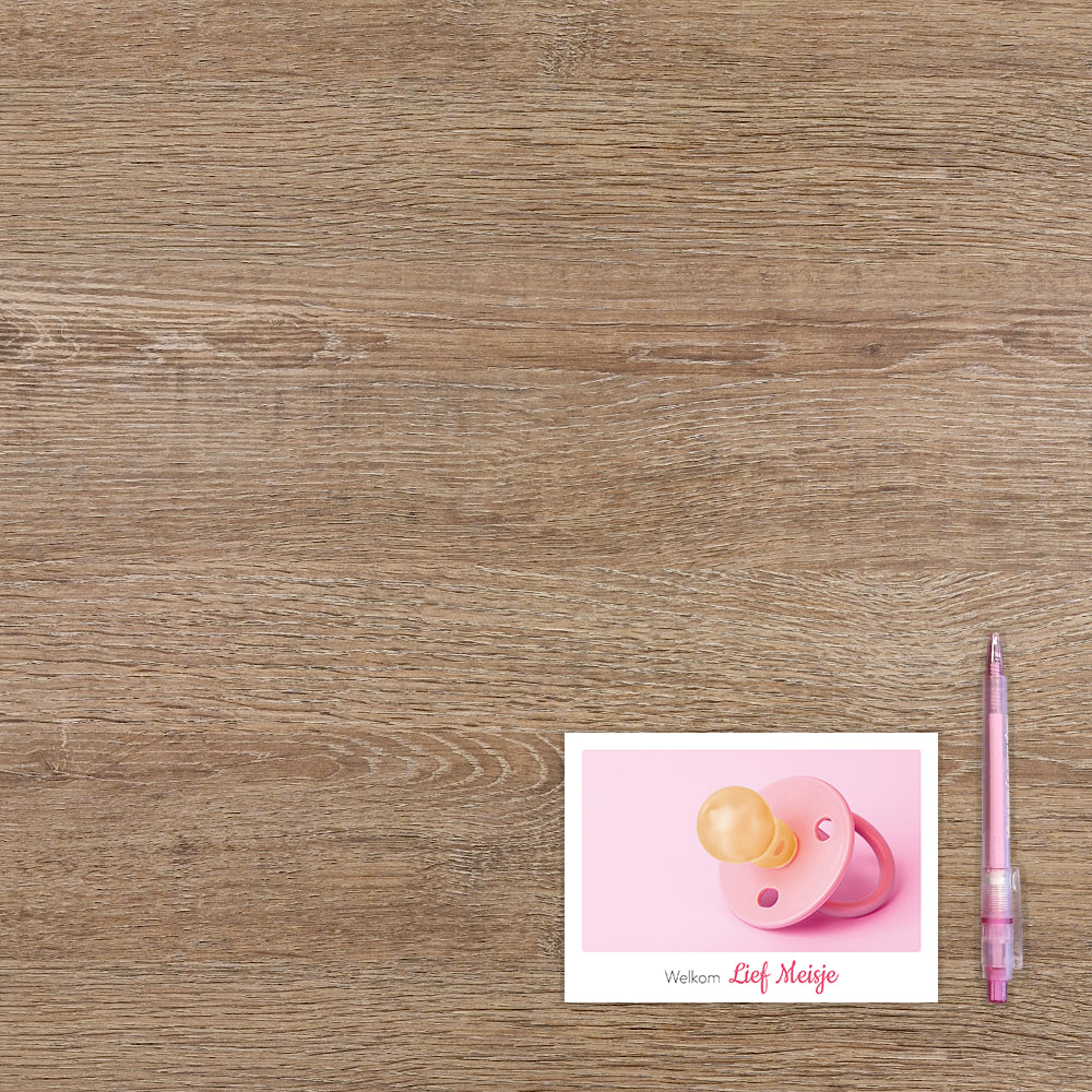 De wenskaart heeft een afmeting van x en een liggende vorm. Op deze wenskaart staat een roze speentje met daaronder de tekst: "Welkom lief meisje". De binnenzijde van de wenskaart is blanco wat voldoende ruimte geeft om een persoonlijke boodschap te schrijven .