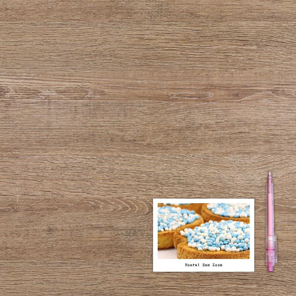 De wenskaart heeft een afmeting van x en een liggende vorm. Op deze wenskaart staan beschuit met blauwe muisjes met daaronder de tekst: "Hoera! Een zoon". De binnenzijde van de wenskaart is blanco wat voldoende ruimte geeft om een persoonlijke boodschap te schrijven .