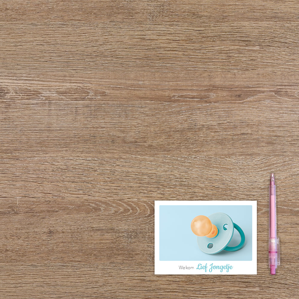 De wenskaart heeft een afmeting van x en een liggende vorm. Op deze wenskaart staat een blauw speentje met daaronder de tekst: "Welkom lief jongetje". De binnenzijde van de wenskaart is blanco wat voldoende ruimte geeft om een persoonlijke boodschap te schrijven .