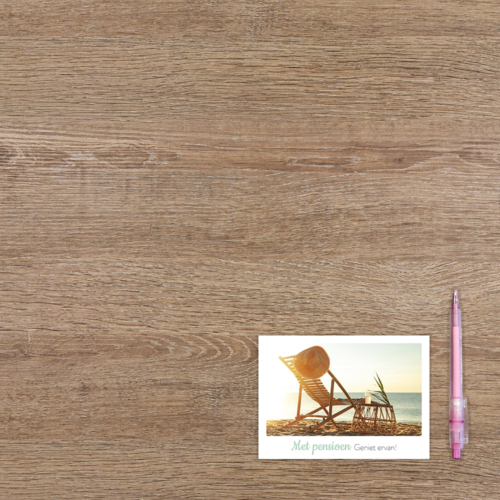 De wenskaart heeft een afmeting van x en een liggende vorm. Op deze wenskaart staat een strandstoel met op de achtergrond de zee. Onder de illustratie staat de tekst: "Met pensioen geniet ervan!". De binnenzijde van de wenskaart is blanco wat voldoende ruimte geeft om een persoonlijke boodschap te schrijven .