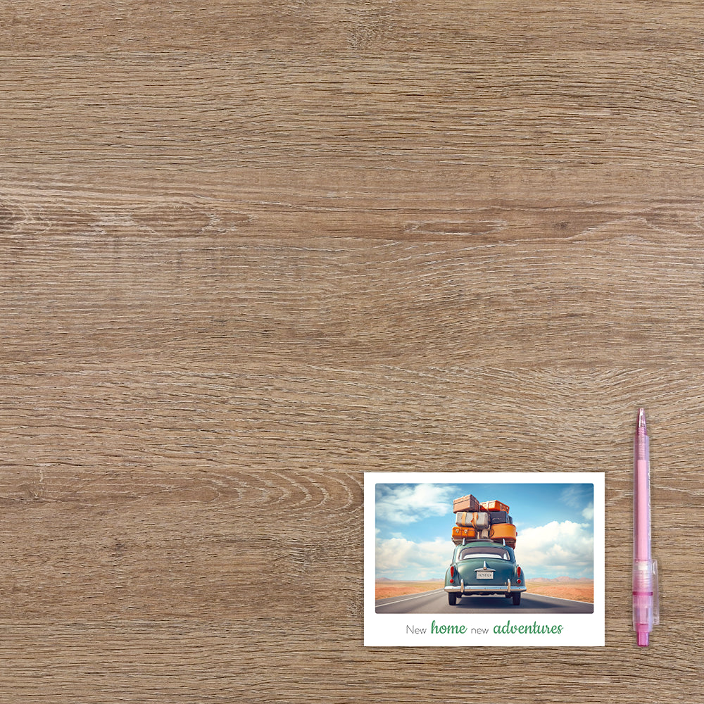 De wenskaart heeft een afmeting van x en een liggende vorm. Op deze wenskaart staat een auto met koffers op het dak die op een weg rijdt. Onder de illustratie staat de tekst: "New home new adventures". De binnenzijde van de wenskaart is blanco wat voldoende ruimte geeft om een persoonlijke boodschap te schrijven .