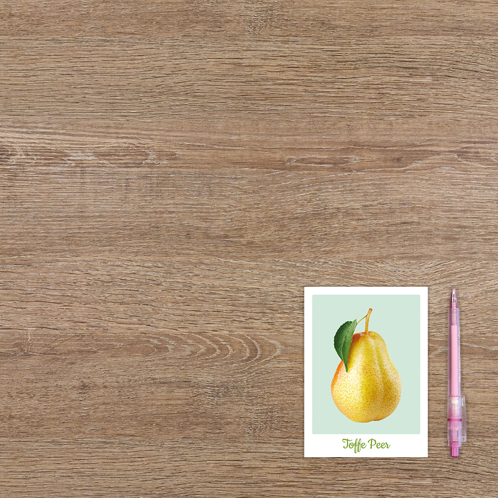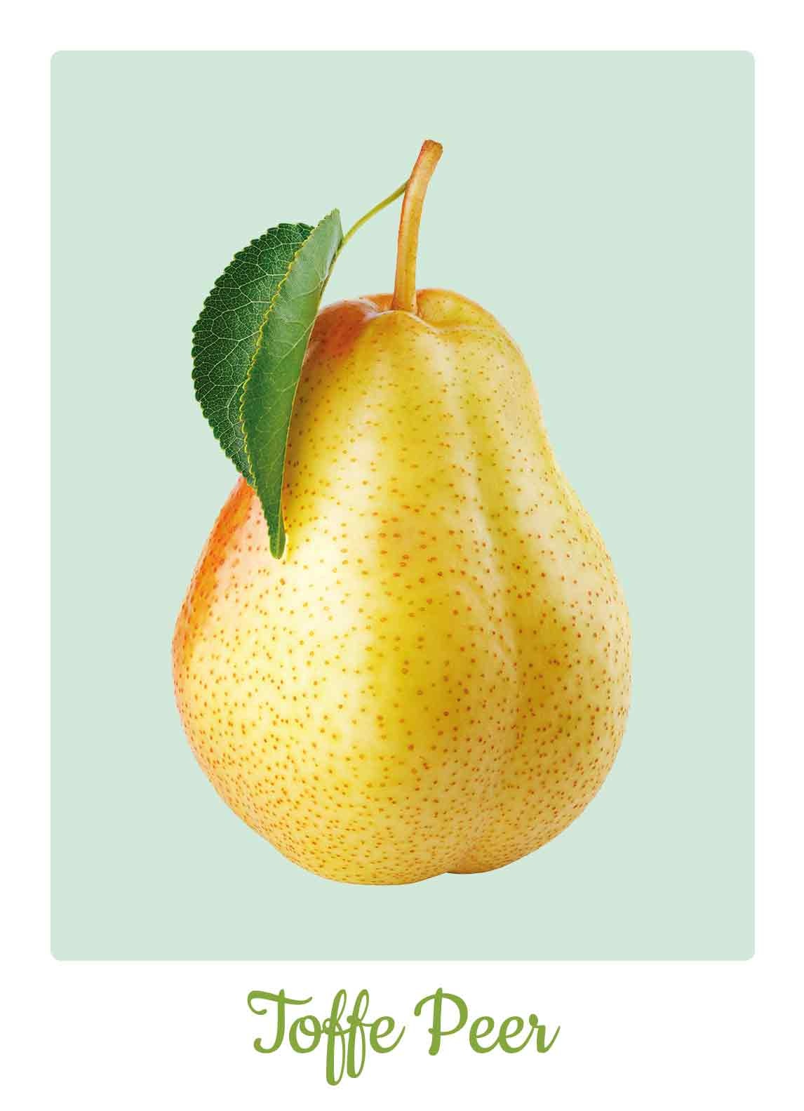 De wenskaart heeft een afmeting van x en een staande vorm. Op deze wenskaart staat een peer op een groene achtergrond met daaronder de tekst: "Toffe peer". De binnenzijde van de wenskaart is blanco wat voldoende ruimte geeft om een persoonlijke boodschap te schrijven .