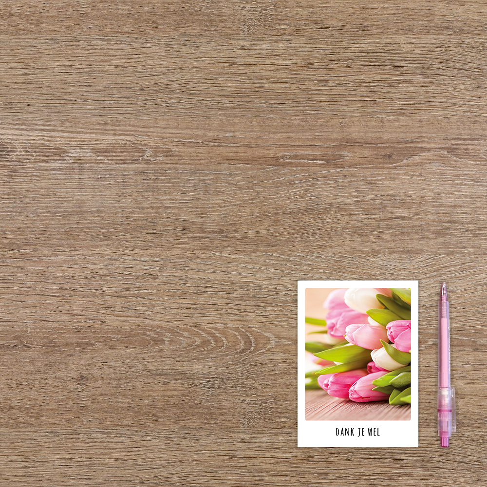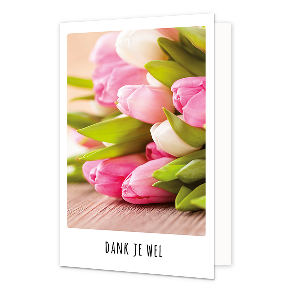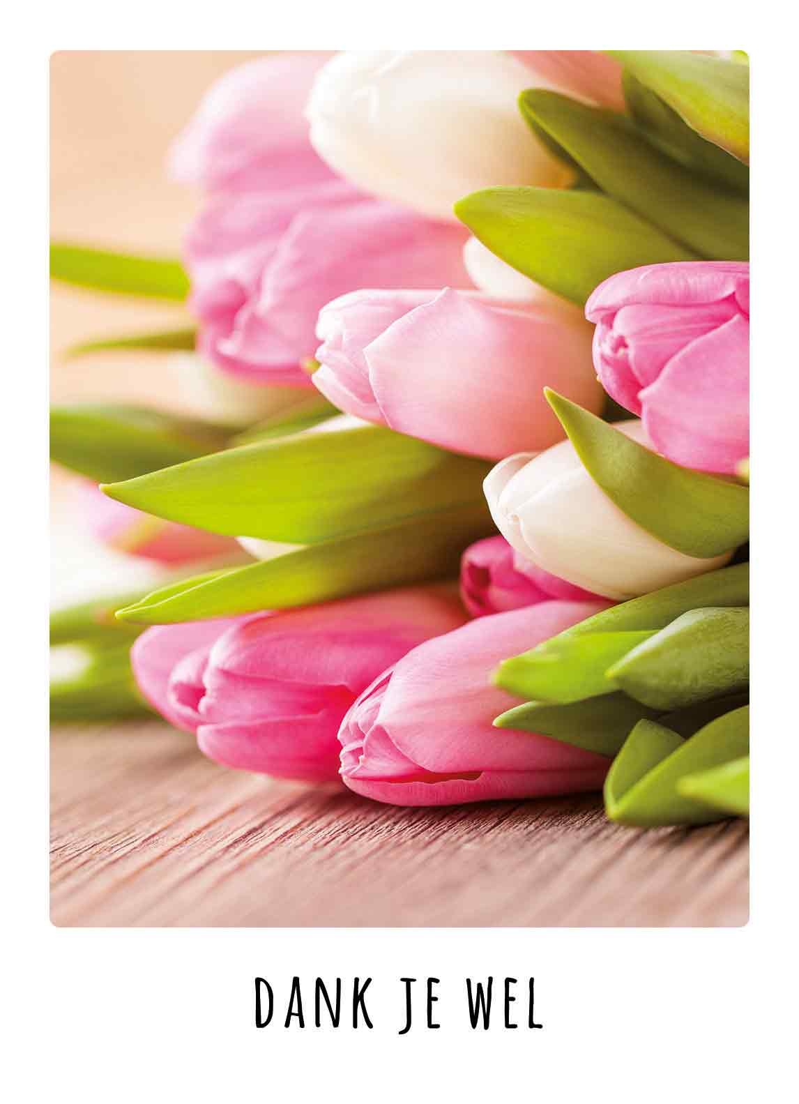De wenskaart heeft een afmeting van x en een staande vorm. Op deze wenskaart staat een boeket tulpen in de kleuren wit en roze. Onder de illustratie staat de tekst: "Dank je wel". De binnenzijde van de wenskaart is blanco wat voldoende ruimte geeft om een persoonlijke boodschap te schrijven .