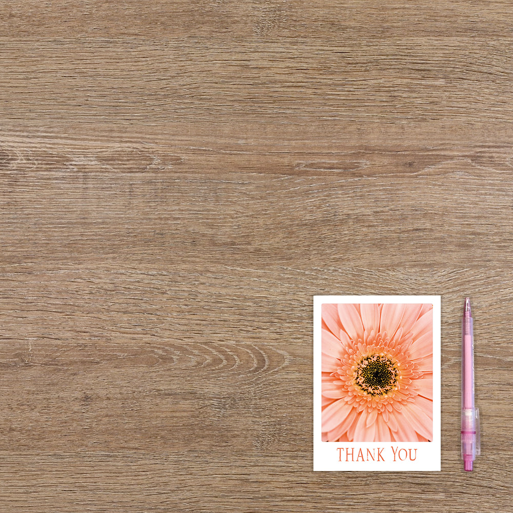 De wenskaart heeft een afmeting van x en een staande vorm. Op deze wenskaart staat een grote oranje bloem met daaronder de tekst: "Thank you". De binnenzijde van de wenskaart is blanco wat voldoende ruimte geeft om een persoonlijke boodschap te schrijven .