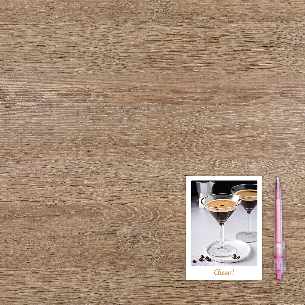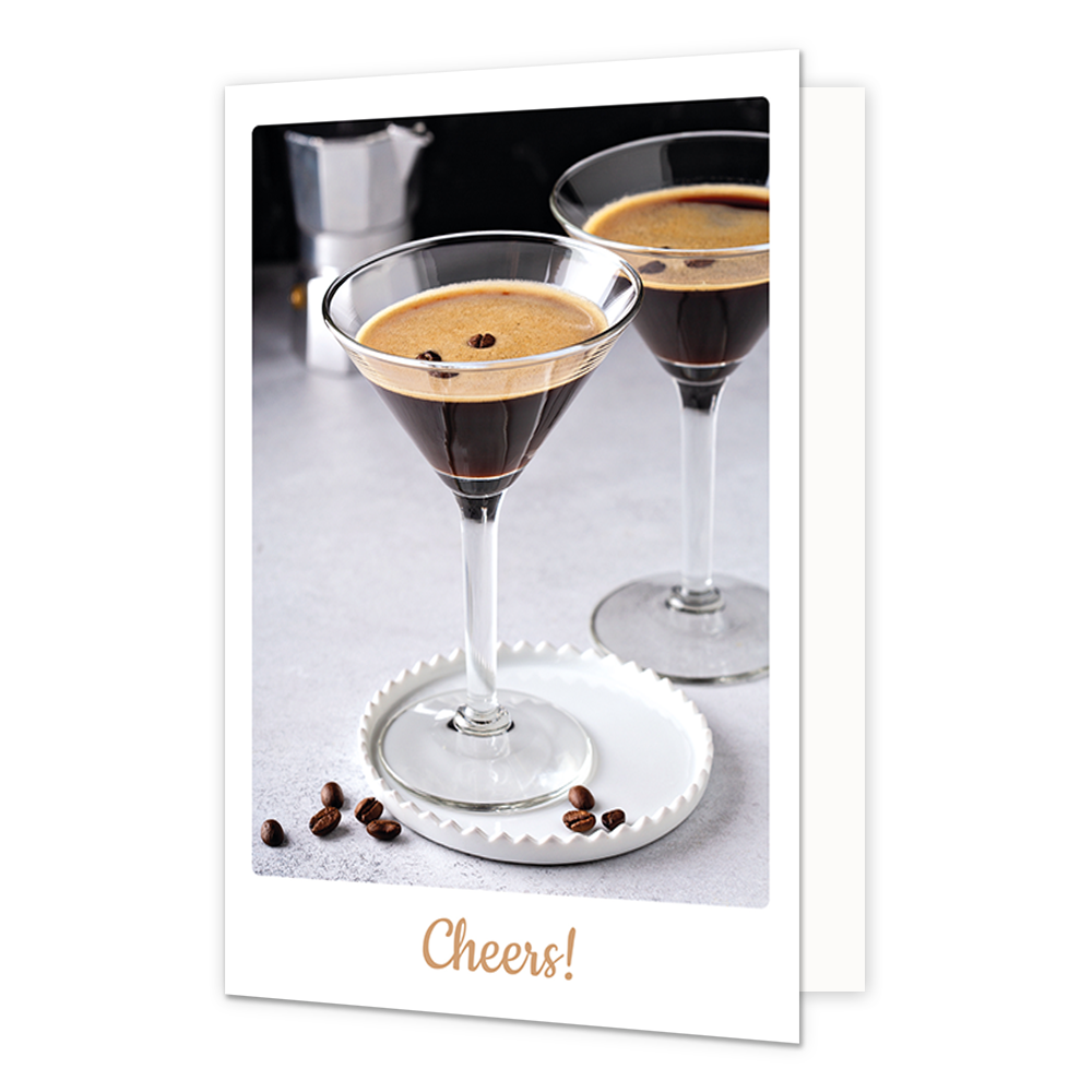 De wenskaart heeft een afmeting van x en een staande vorm. Op deze wenskaart staan twee espresso martini's met daaronder de tekst: "Cheers!". De binnenzijde van de wenskaart is blanco wat voldoende ruimte geeft om een persoonlijke boodschap te schrijven .