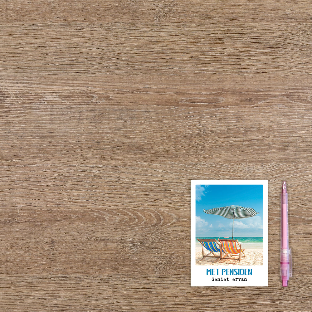 De wenskaart heeft een afmeting van x en een staande vorm. Op deze wenskaart staan twee strandbedjes met een parasol die uitkijken op de zee. Onder de illustratie staat de tekst: "Met pensioen geniet ervan". De binnenzijde van de wenskaart is blanco wat voldoende ruimte geeft om een persoonlijke boodschap te schrijven .