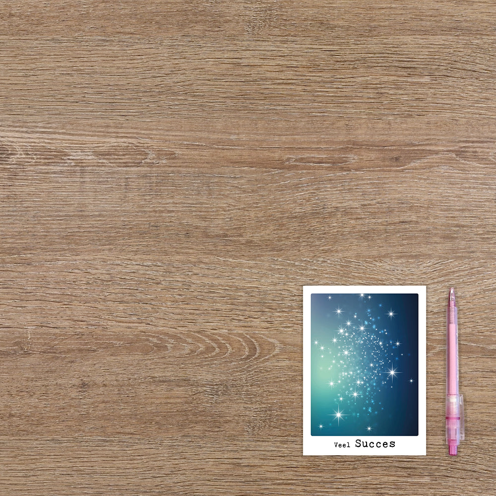 De wenskaart heeft een afmeting van x en een staande vorm. Op deze wenskaart staan witte sterren op een donkerblauwe hemel achtergrond. Onder de illustratie staat de tekst: "Veel succes". De binnenzijde van de wenskaart is blanco wat voldoende ruimte geeft om een persoonlijke boodschap te schrijven .