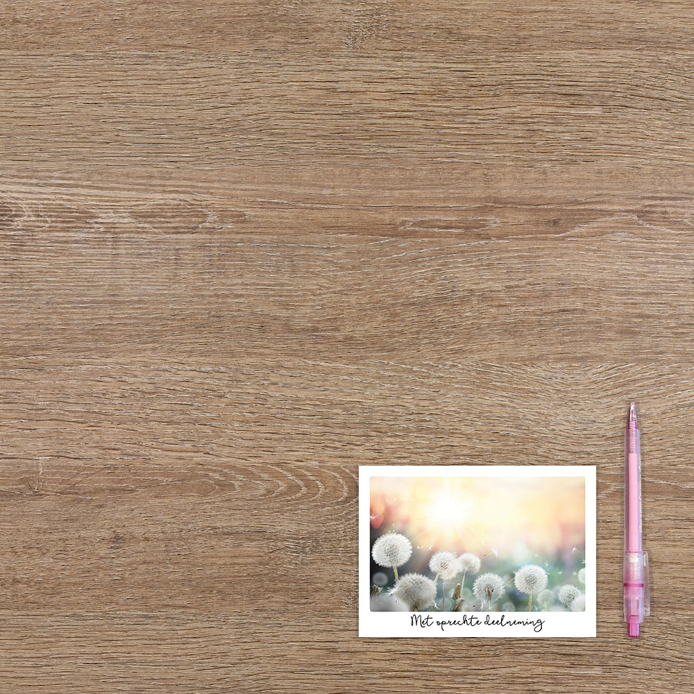 De wenskaart heeft een afmeting van x en een liggende vorm. Op deze wenskaart staan paardenbloemen met op de achtergrond een schijnende zon. Onder de illustratie staat de tekst: "Met oprechte deelneming". De binnenzijde van de wenskaart is blanco wat voldoende ruimte geeft om een persoonlijke boodschap te schrijven .